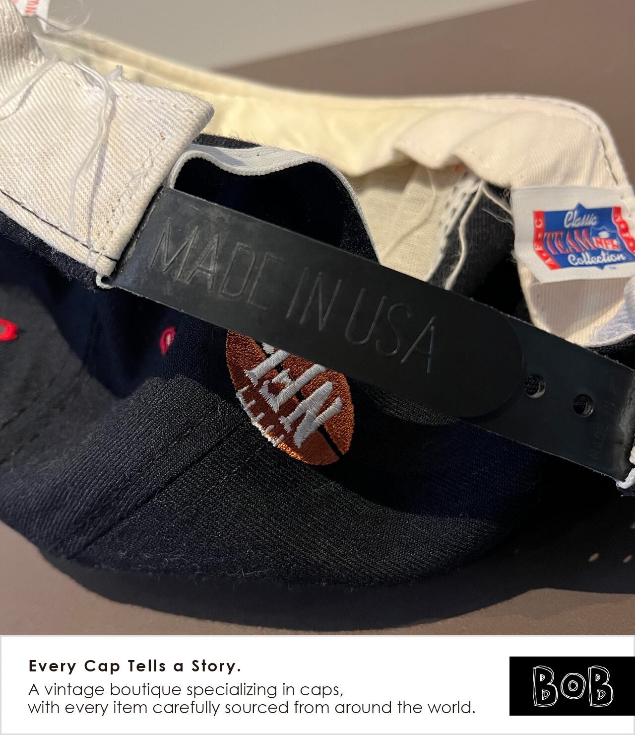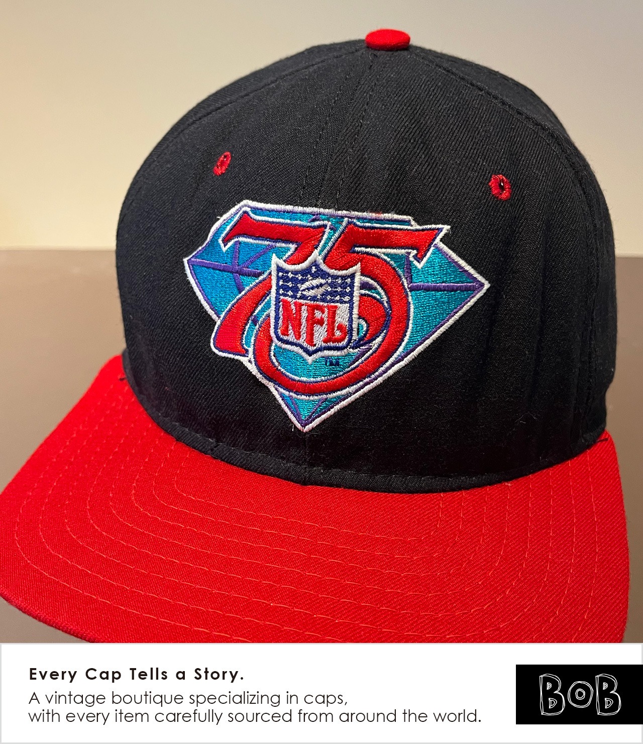 NFL創設75周年を記念して1994年に製作されたオフィシャルプロモキャップ。New Era製・USA製スナップバックで、内側には当時使われていたNew Era筆記体ロゴの〈PRO MODEL〉タグと〈Classic TEAM NFL Collection〉タグ。アンダーバイザーはグレー。Vintage NEW ERA × NFL × 記念モデルは希少。