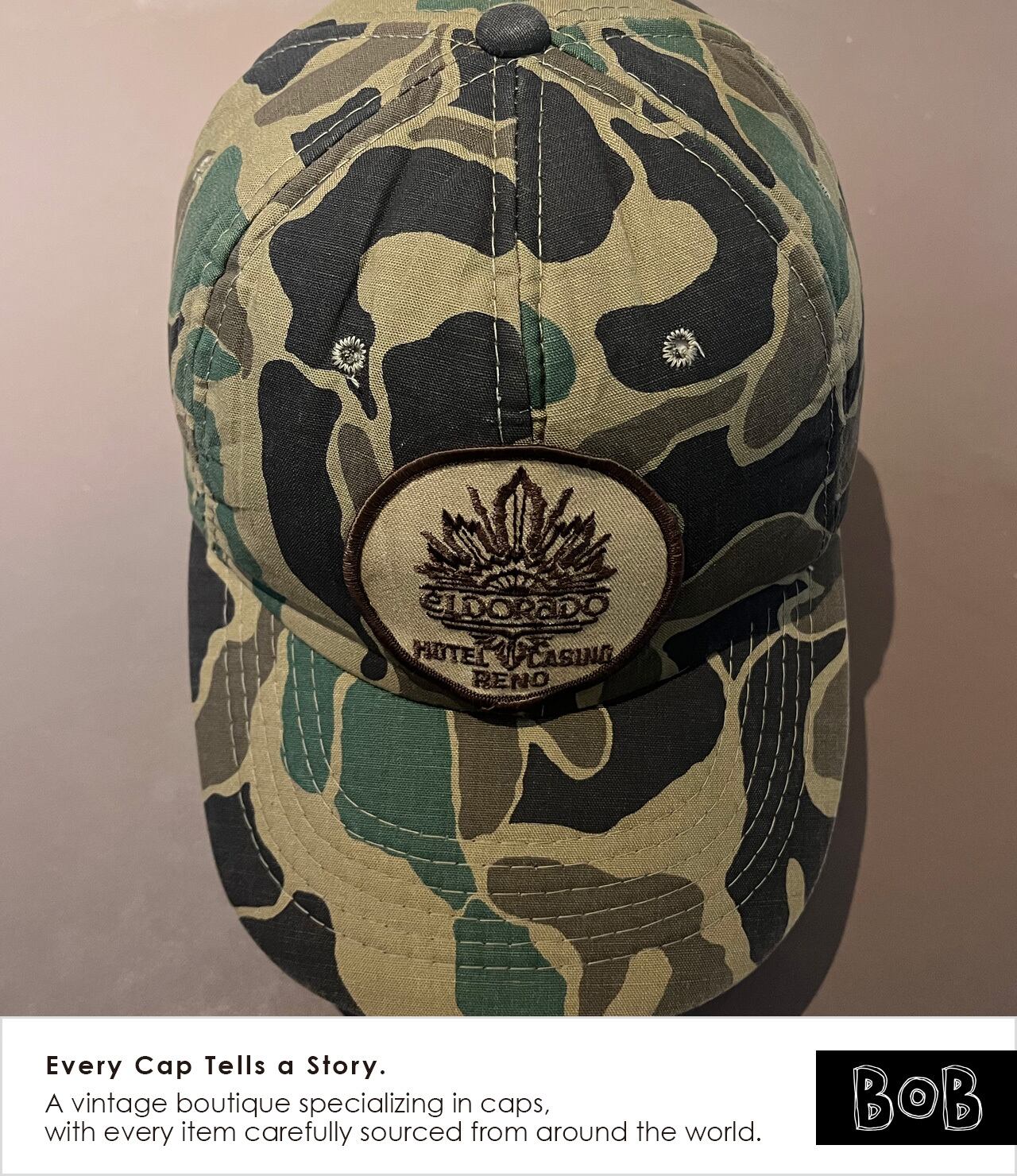A 90s souvenir cap from the long-established Eldorado Hotel & Casino in Reno, Nevada. Features a U.S. military-style M81 woodland camo body and a patch with the classic logo used through the 1990s. The interior is lined with soft, cushiony fleece for added warmth and comfort.