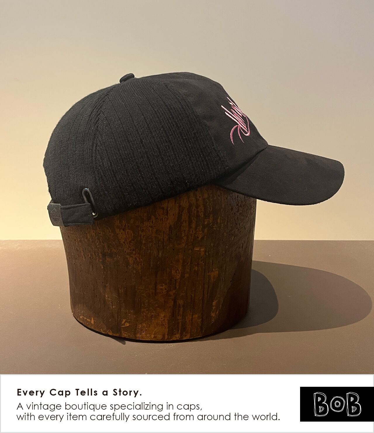 HARLEY-DAVIDSON(ハーレーダビッドソン)の00sキャップ。フェイクスエード調のフロントにピンクのトライバル調筆記体ロゴ。GENUINE MOTORCLOTHESタグ付きの正規ライセンス品。