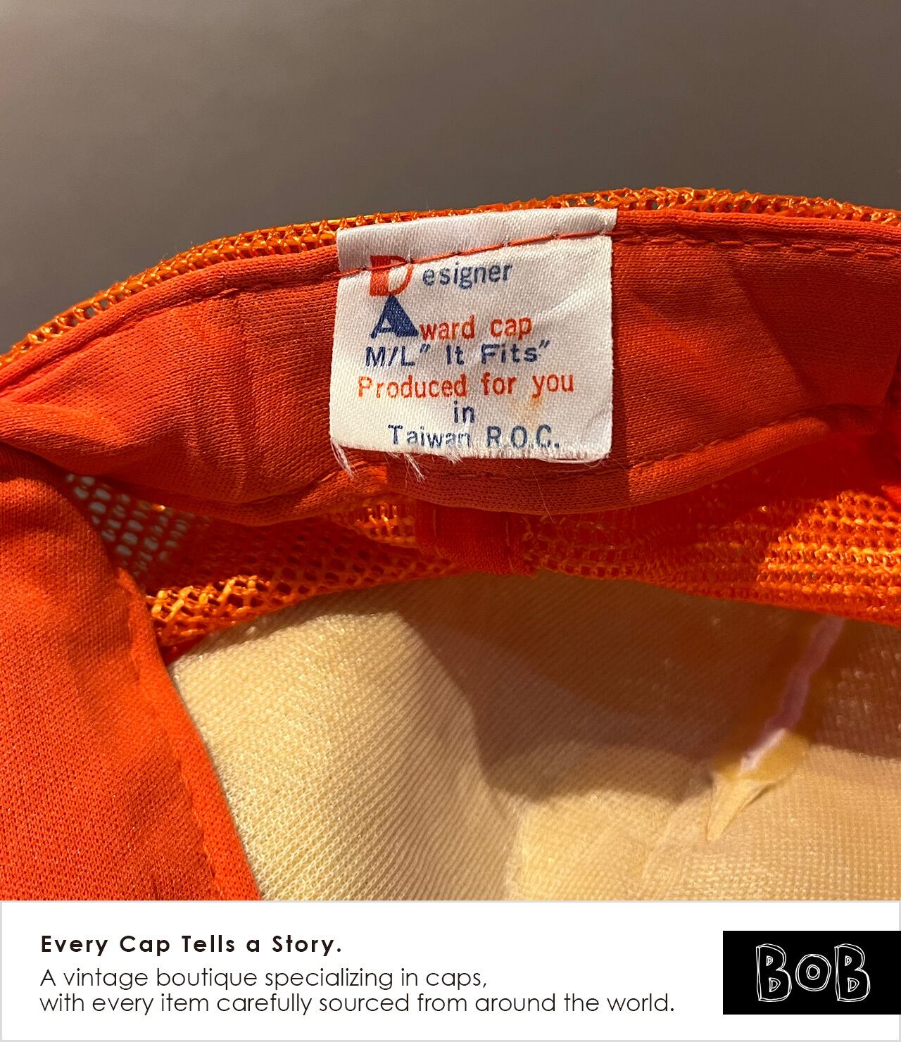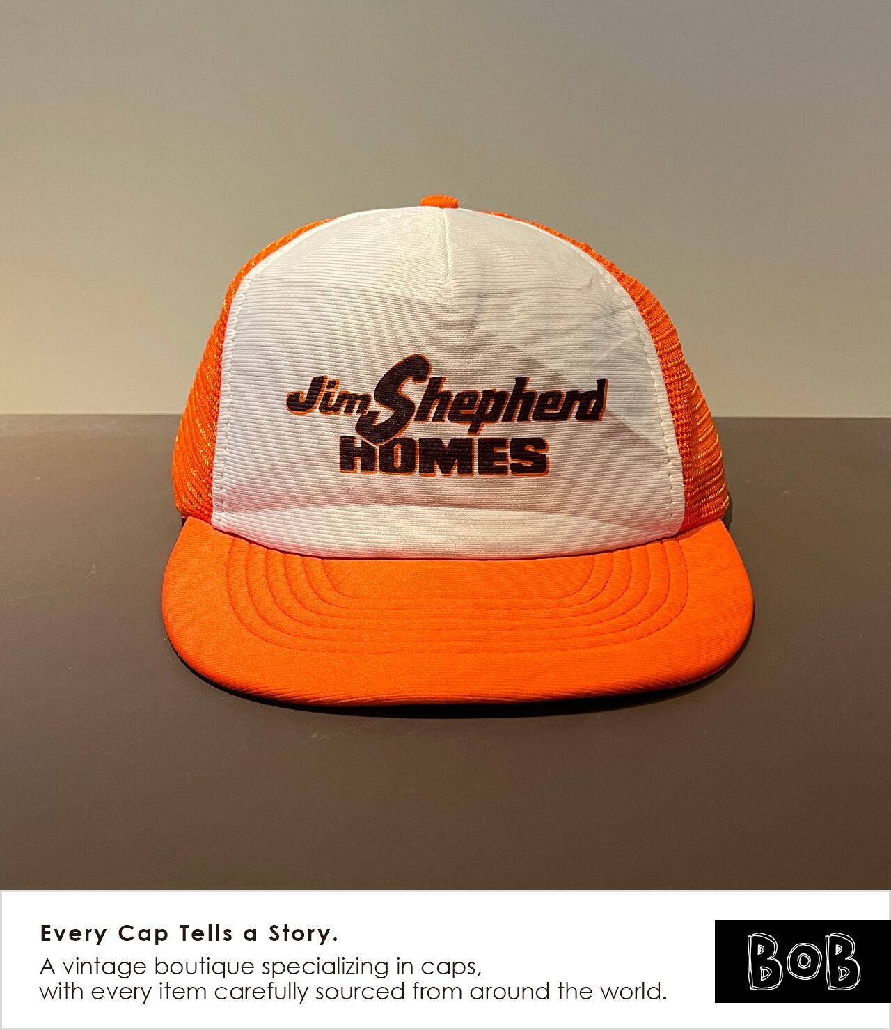 アメリカの住宅会社〈Jim Shepherd Homes〉の企業プロモトラッカーキャップ。オレンジ×ホワイトのオールドスクールなツートーンメッシュ。ロゴのフォントも配色も当時ものらしい抜け感。1988〜1993年ごろ製造の台湾ボディ(Made in Taiwan R.O.C.)。