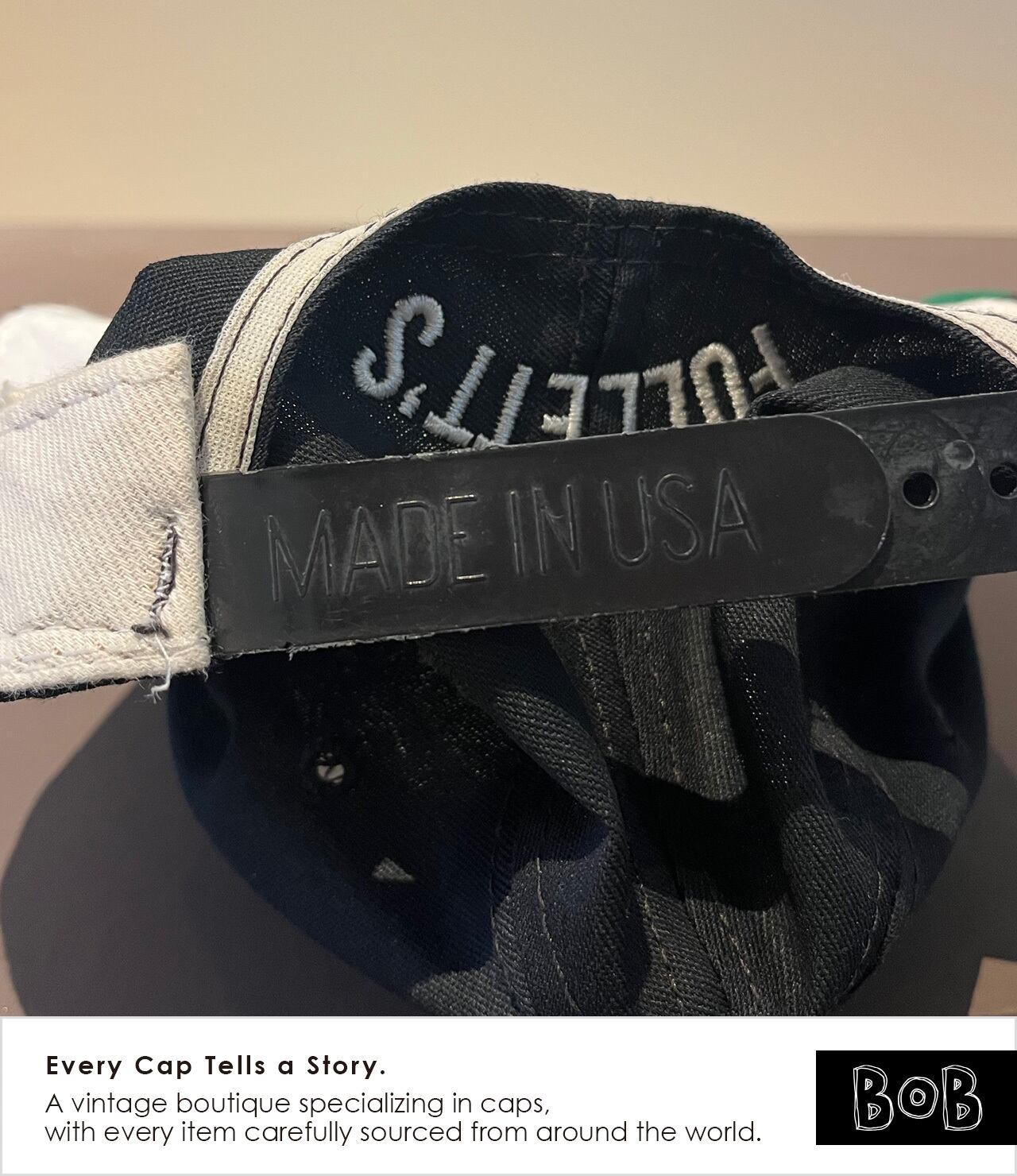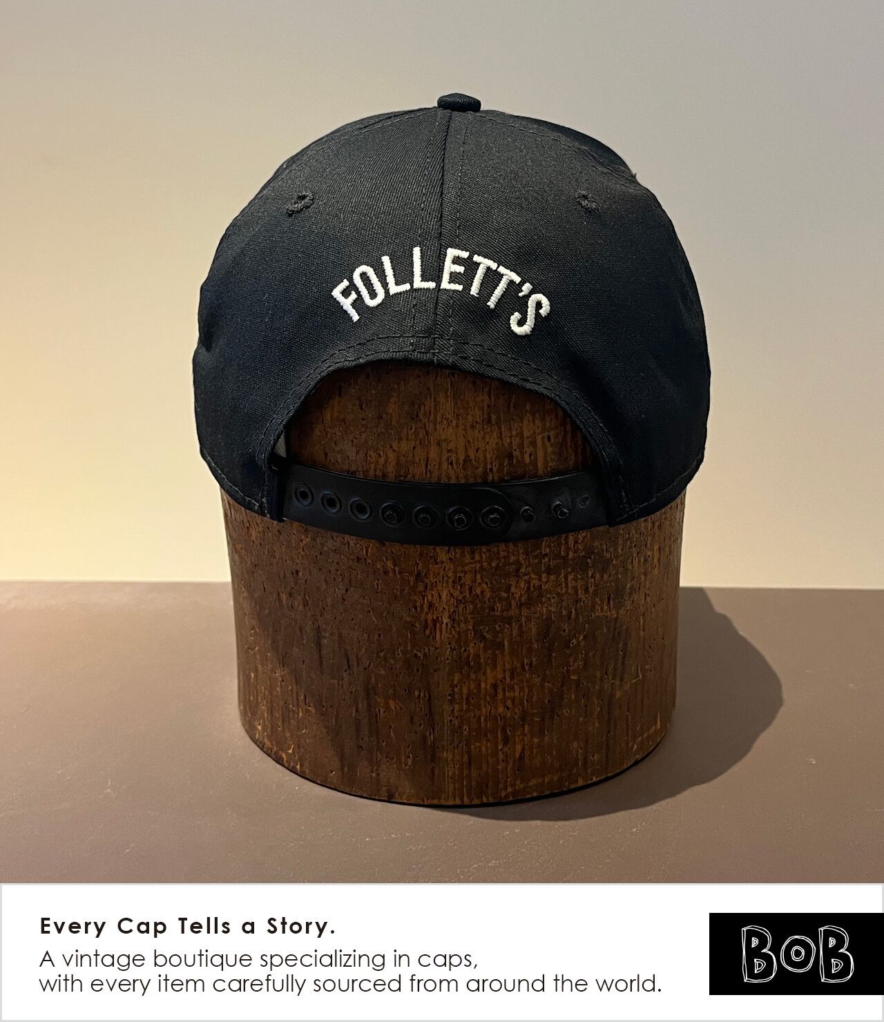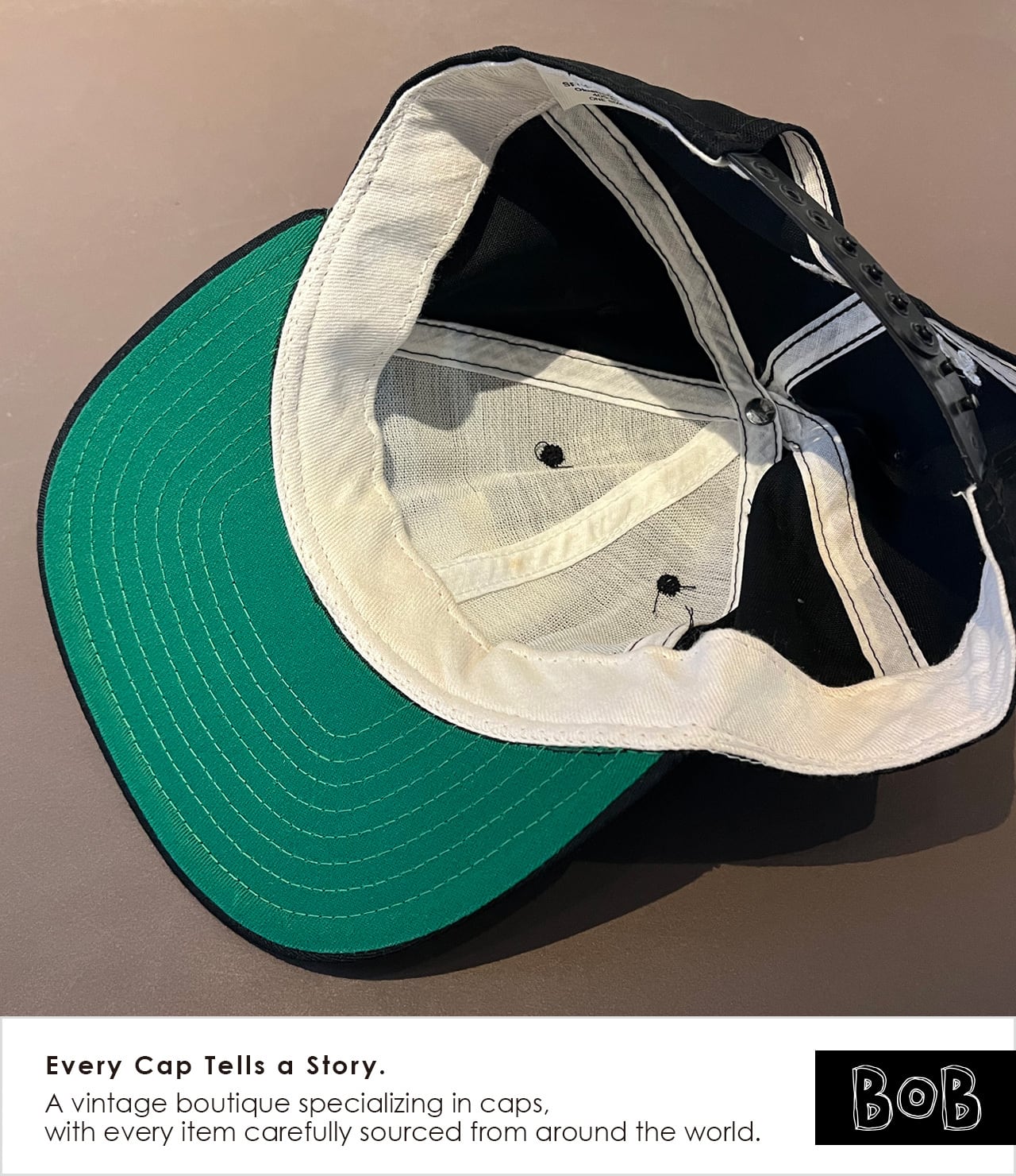 アメリカの老舗書店チェーン〈FOLLETT’S〉の90sプロモキャップ。フロントには書店ならではのメッセージ「THE FIRST STOP TO INTELLIGENT LIFE IN THE UNIVERSE!!(宇宙で最初に知的生命体と出会える場所)」。CLASSIC SPORTSWEAR社製のMADE IN USAタグ、グリーンアンダーバイザー、スナップ裏の刻印など、90sアメリカ製らしいディテール満載。A 90s promo cap from FOLLETT’S, a long-established American college bookstore chain. The front features a bookstore-worthy message: “THE FIRST STOP TO INTELLIGENT LIFE IN THE UNIVERSE!!” — a witty nod to knowledge as the gateway to intelligence. Made by CLASSIC SPORTSWEAR with a MADE IN USA tag, it comes with a green undervisor and USA-embossed snapback, showcasing classic 90s American cap details throughout.