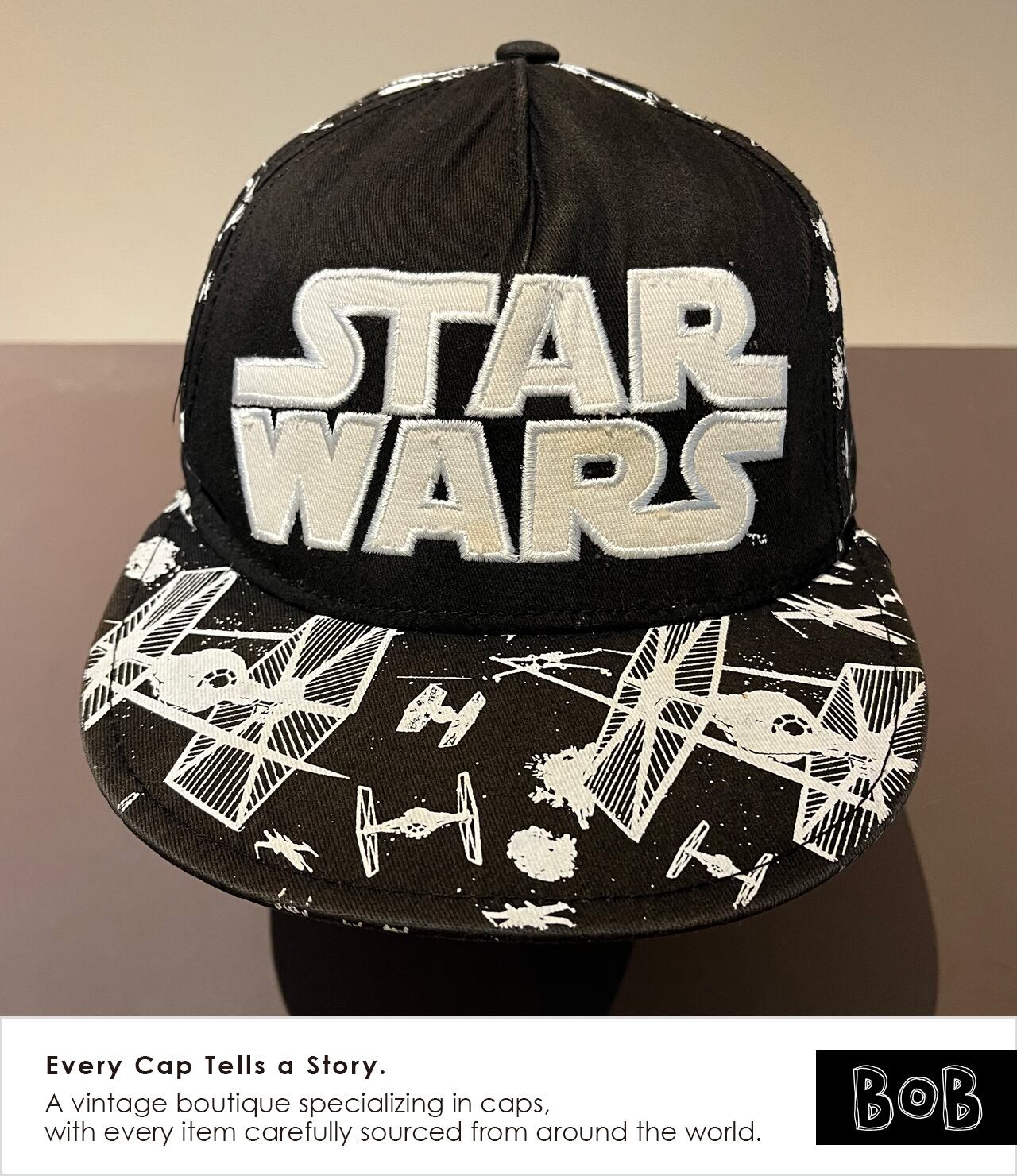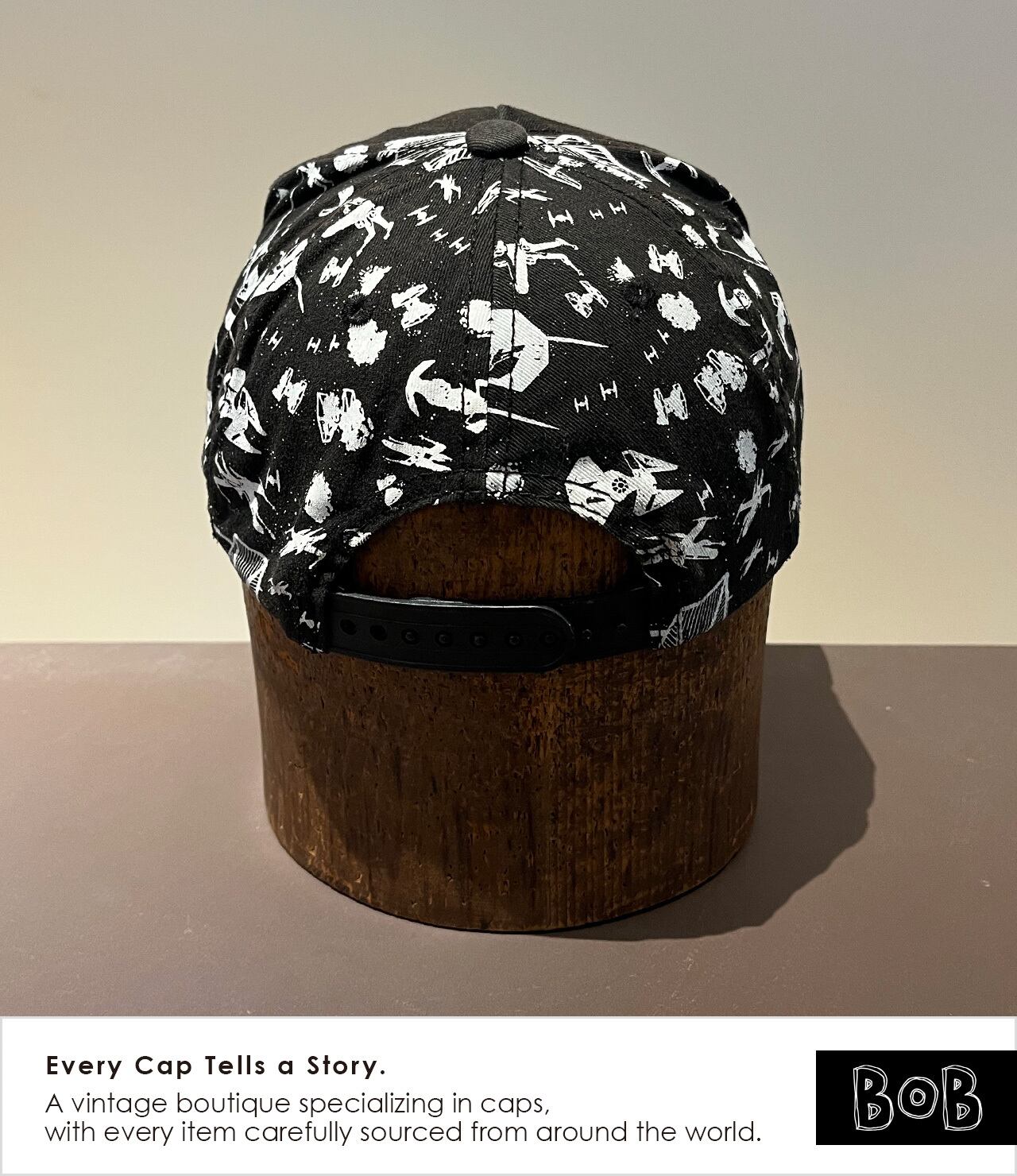 映画『STAR WARS』旧三部作の世界観を象徴するTIEファイターやXウィングをモノトーンで描いた総柄5パネルキャップ。銀河戦争を思わせるグラフィックに立体ロゴ刺繍。Lucasfilm公式ライセンスタグ付きで00年代後半頃のモデル。A 5-panel cap featuring a monochrome allover print of TIE Fighters and X-Wings, iconic elements from the original Star Wars trilogy. The galactic battle–inspired graphic is paired with a 3D embroidered logo. Comes with an official Lucasfilm license tag and is believed to be from the late 2000s.
