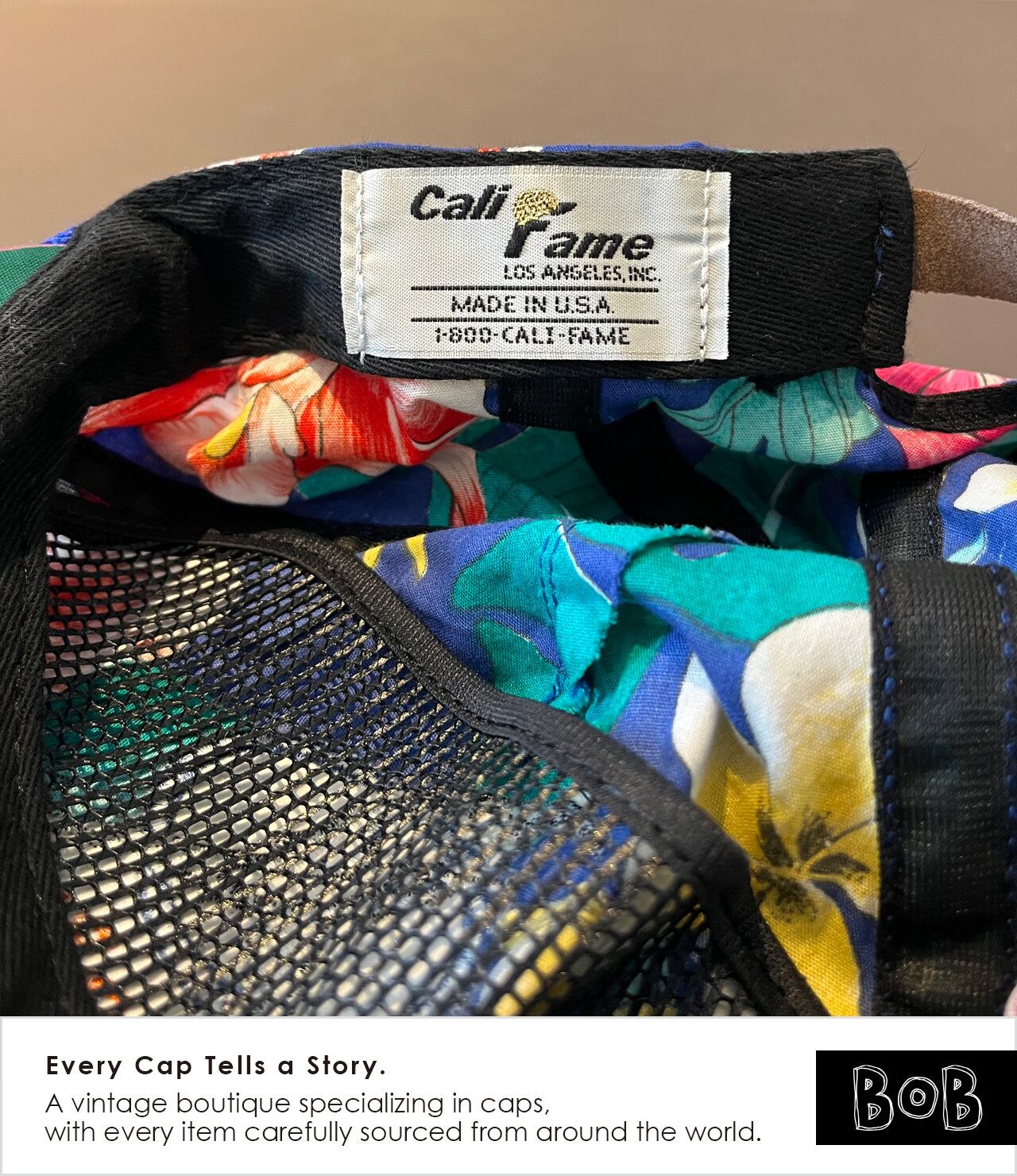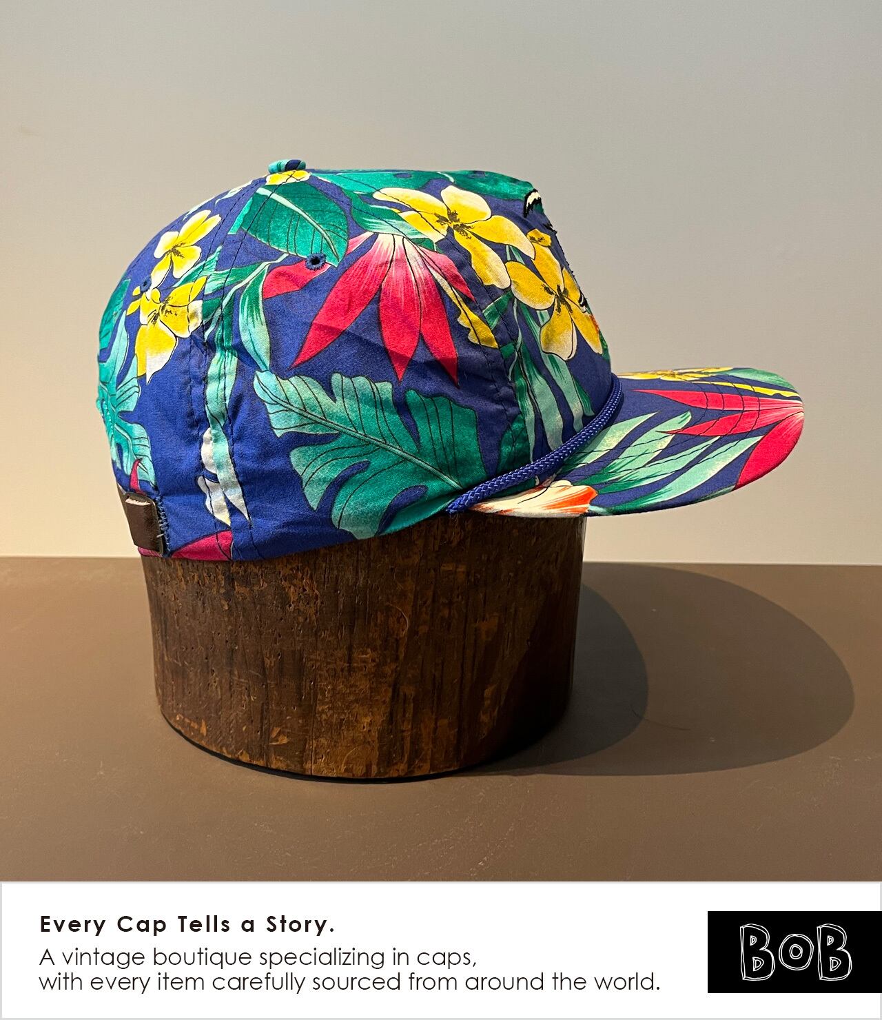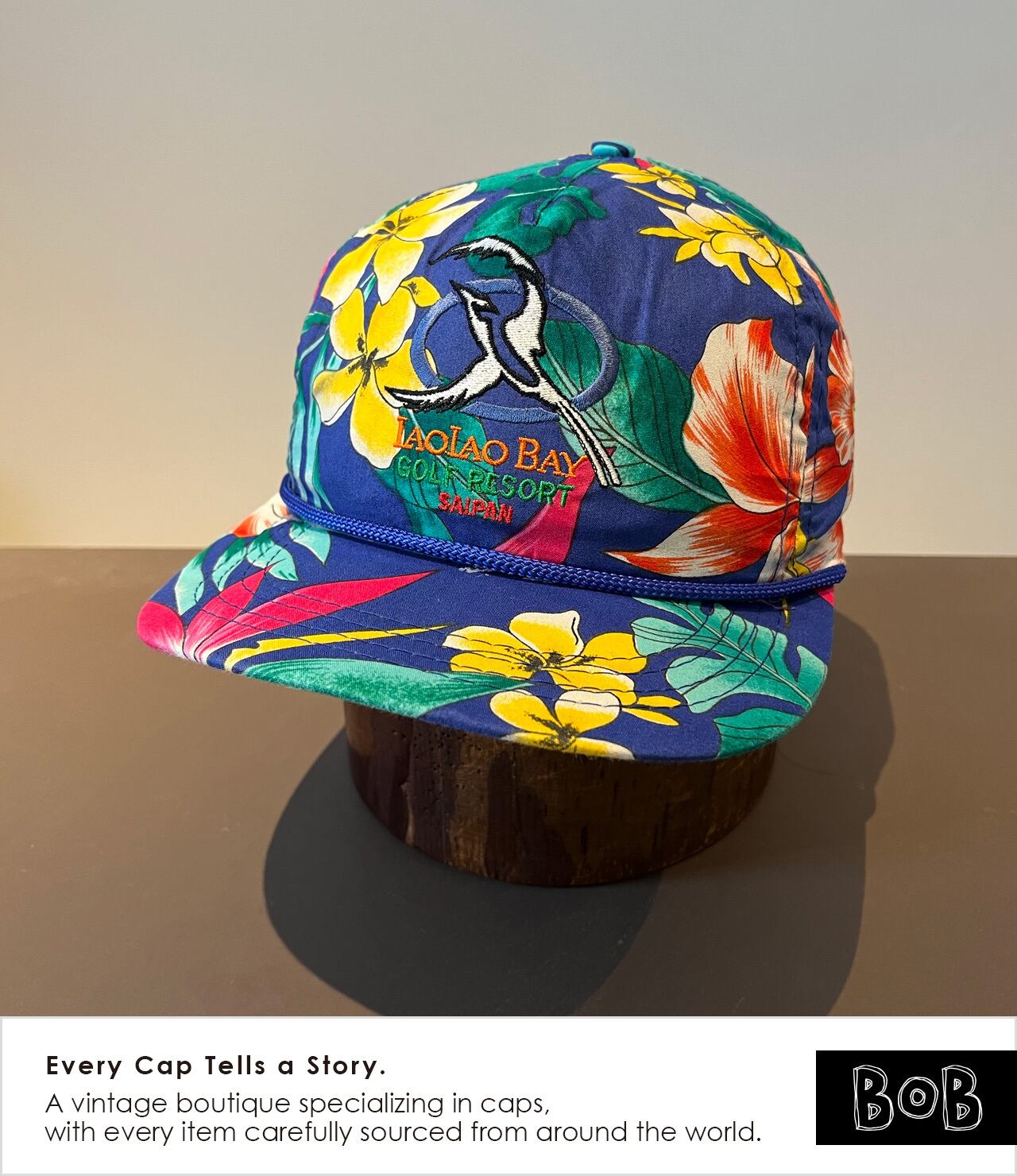 サイパンのゴルフリゾート〈LaoLao Bay Golf Resort〉の5パネルロープキャップ。ロイヤルブルーのボディにハイビスカスやプルメリアなどのトロピカル総柄。Cali Fame製の90年代前半〜中盤のアメリカ製で、レザーストラップには素押しロゴ入り。コレクターアイテムとしても評価の高いUSメイドのリゾート系総柄ロープキャップです。A 5-panel rope cap from LaoLao Bay Golf Resort in Saipan. Features a royal blue body with an all-over tropical pattern of hibiscus and plumeria flowers. Made in the USA by Cali Fame in the early to mid-1990s, with a debossed logo on the leather strap. A US-made resort-style tropical rope cap highly regarded among collectors.