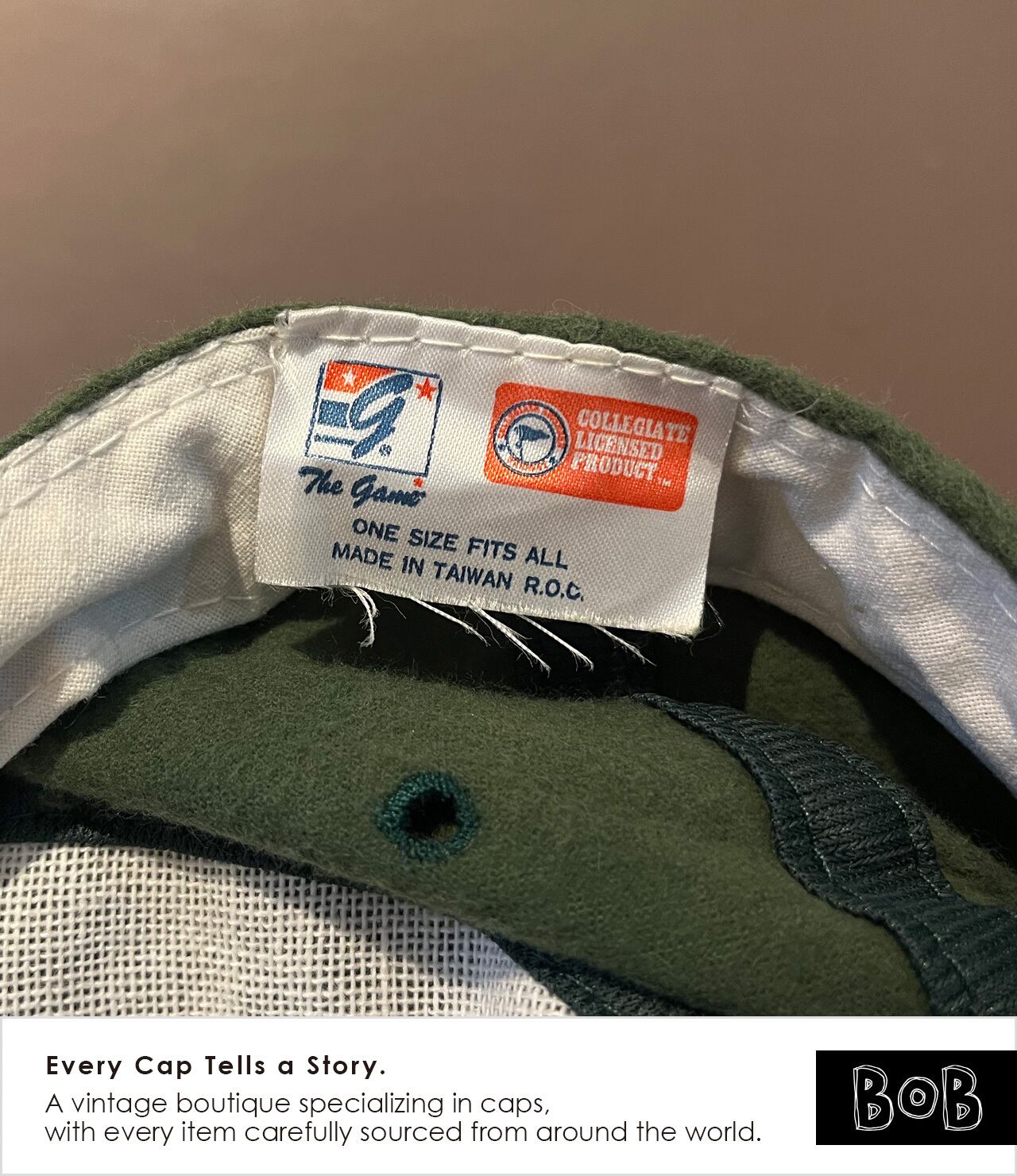 University of Miami(マイアミ大学)の90年代前半頃のカレッジキャップ。スクールカラーのダークグリーン×オレンジ、起毛ボディに大型チェニール“M”ロゴ。The Gameタグ/COLLEGIATE LICENSED PRODUCT/MADE IN TAIWAN R.O.C.の当時物。University of Miami college cap from the early 1990s. Dark green × orange in school colors, with a napped body and a large chenille “M” patch. Features The Game label, COLLEGIATE LICENSED PRODUCT, and MADE IN TAIWAN R.O.C.—an authentic piece from the era.