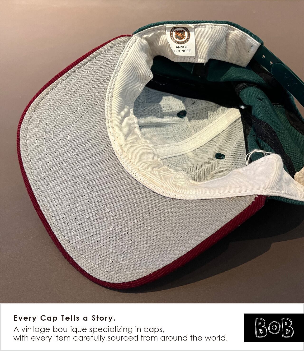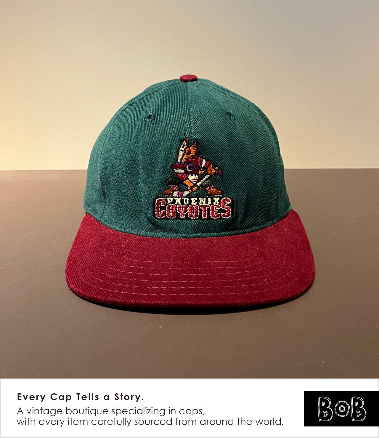 NHL Phoenix Coyotes(フェニックス・コヨーテズ)の90s公式ライセンスキャップ。1996–2003に採用されたコヨーテが幾何学的に描かれた“カチナ(Kachina)ロゴ” x “PHOENIX COYOTES”表記が並ぶ、カルト的人気を誇る希少なデザイン。Annco社製USAメイド。NHL Phoenix Coyotes 90s officially licensed cap. Features the geometric “Kachina” coyote logo (used 1996–2003) alongside the “PHOENIX COYOTES” wordmark—a cult-favorite, hard-to-find design. Made in USA by Annco.