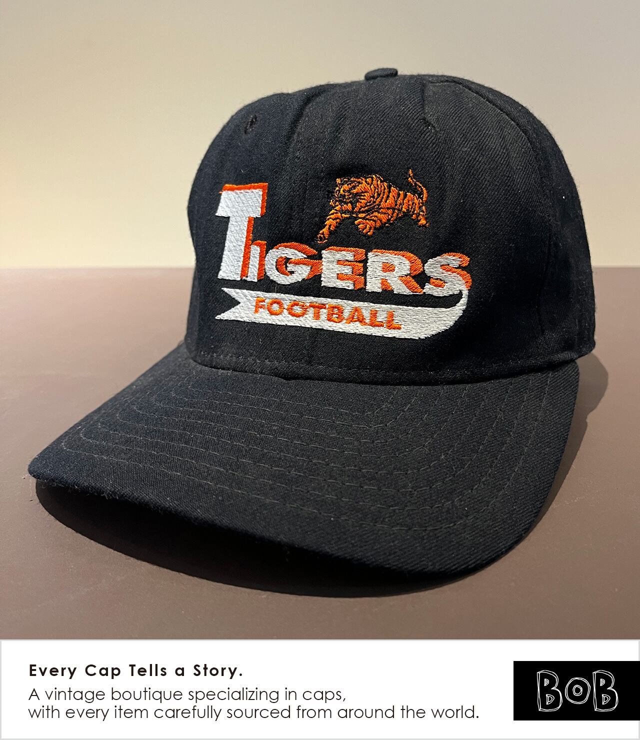 正体不明のフットボールチーム「TIGERS FOOTBALL」の90sNewEraウールキャップ。時代を写すNewEraオールドタグには「キャップロゴ」とMADE IN USA表記。Vintage 1990s New Era wool cap for the unidentified football team “TIGERS FOOTBALL.” The period-correct New Era Cap Logo tag features the MADE IN U.S.A. mark.