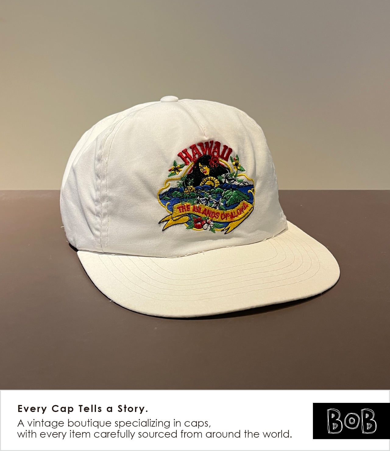 1980年代末〜90年代初期ころ製造、ハワイのスーベニアキャップです。ホワイトのポリコットンボディに、ハワイの女性・火山・サンセット・トロピカルフラワー・海などハワイを象徴するグッドグラフィック&カラフルな刺繍。Produced around the late 1980s to early 1990s, this Hawaiian souvenir cap features a white poly-cotton body with colorful embroidery depicting iconic Hawaiian imagery — a woman, volcano, sunset, tropical flowers, and the sea. A vibrant graphic piece that perfectly captures the spirit of the islands.