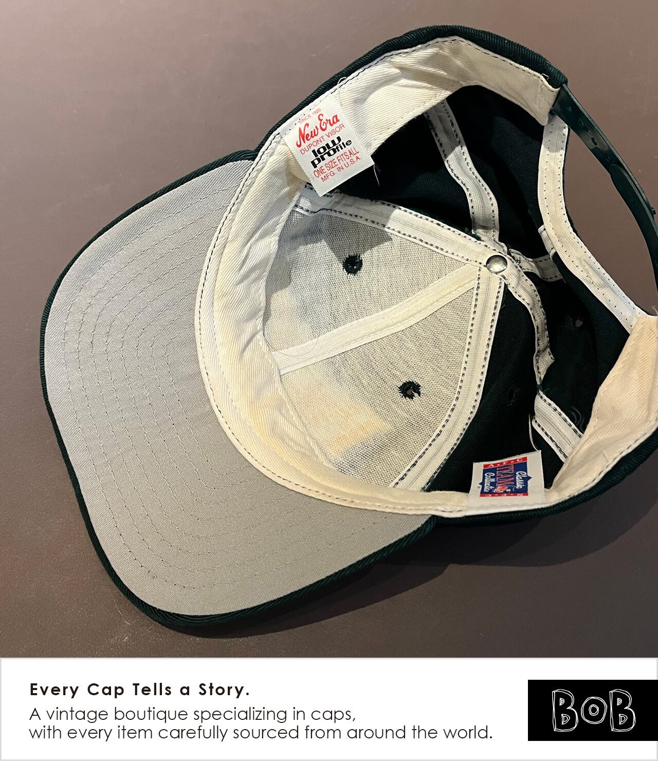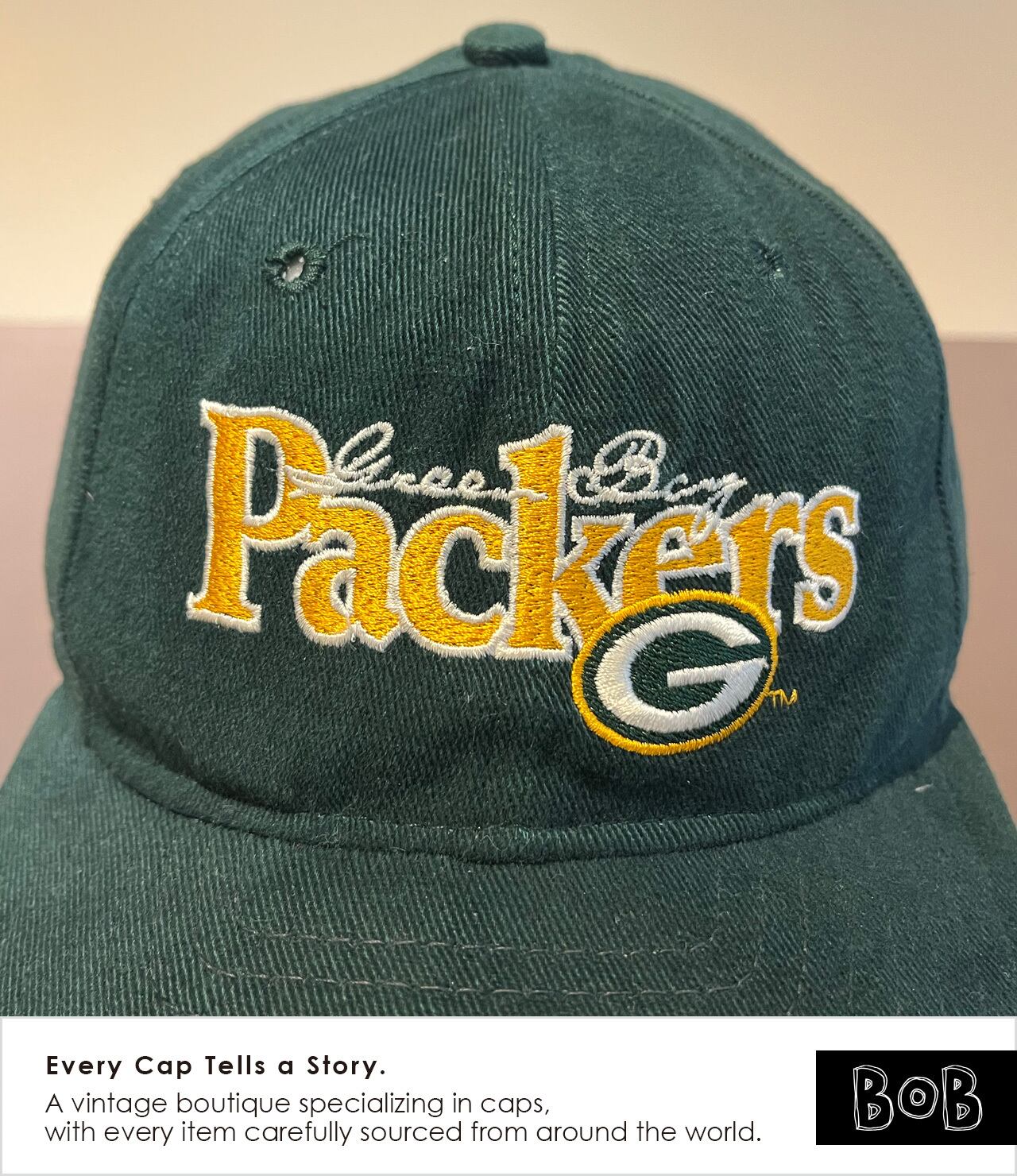 NFL Green Bay Packers(グリーンベイ・パッカーズ)のNFL公式ライセンスキャップ。80s後半〜90s初期に製造されたアメリカ製ビンテージで、浅めクラウンの"ロープロファイル"シルエット。Old New EraタグとNFL Classic Team Collectionタグ付き。 Officially licensed NFL Green Bay Packers cap, made in the USA in the late 1980s to early 1990s. Features a low-profile crown with an authentic vintage silhouette. Comes with the Old New Era tag and NFL Classic Team Collection label.