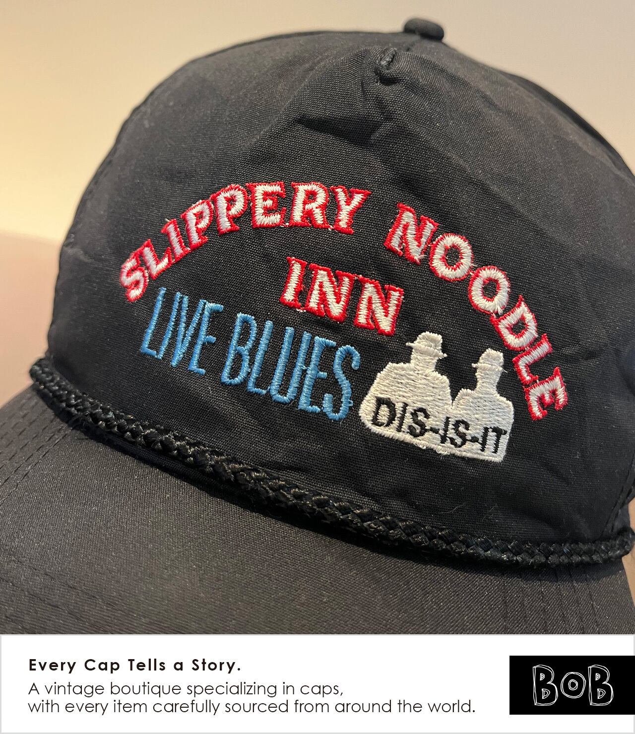 1850年創業。アメリカで最も歴史のあるバーの一つであり、B.B.キングやルーサー・アリソンといった伝説的なミュージシャンも訪れたブルースの聖地で、インディアナポリスの夜をブルースで満たしてきた、伝説のライブバー「Slippery Noodle Inn」の5パネルロープキャップ。Founded in 1850, the Slippery Noodle Inn is one of the oldest bars in America and a legendary blues landmark in Indianapolis that has hosted icons like B.B. King and Luther Allison. This five-panel rope cap pays tribute to the venue that has filled Indianapolis nights with live blues for generations — a true piece of music history.