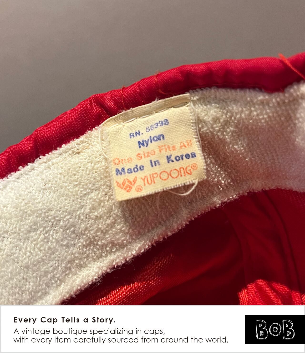 Yupoong製80sナイロンキャップ。赤い軽量ナイロンにハチドリと"Desert Springs"の刺繍、サテン裏地とパイルスウェットバンドのオールドスクールな組み合わせ。カリフォルニア・パームデザート(Palm Desert)の80年代後半のスーベニア物と推測されます。Yupoong nylon cap from the 1980s. Made of lightweight red nylon with a hummingbird and “Desert Springs” embroidery, featuring a classic old-school combination of satin lining and pile sweatband. Believed to be a late-80s souvenir piece from Palm Desert, California.