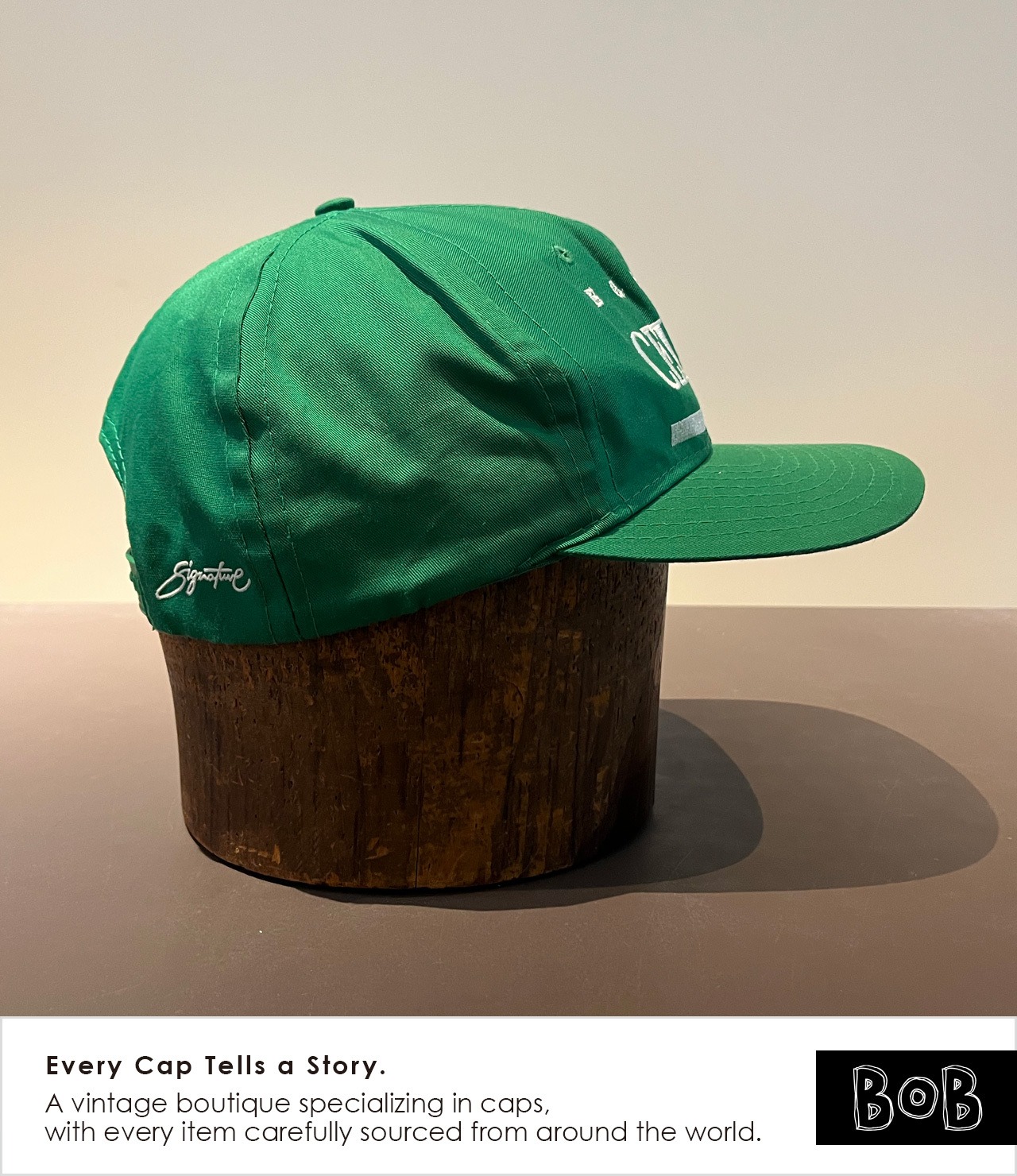 NBA Boston Celtics(ボストン・セルティックス)の90年代初頭のNBA公式ライセンスキャップ。フロントにはマスコットキャラクターを使わず、タイポグラフィと幾何学的なカラーブロックのみで構成されたモダンなグラフィック。バックサイドに「Signature」の筆記体刺繍が入る、当時のAJD社製の中でもデザイン性の高さが際立つケリーグリーンボディ。