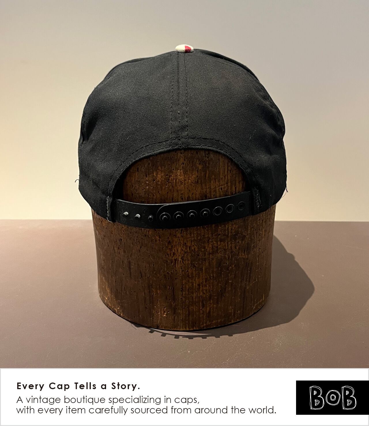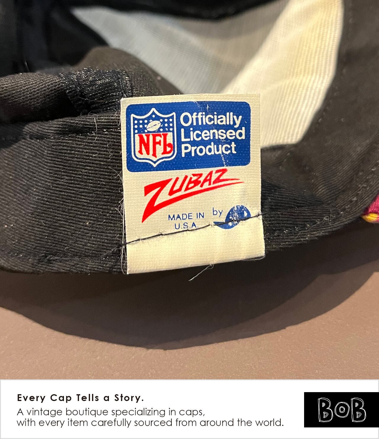 NFL Washington Redskins(現Commanders)が1992年開催のSuper Bowl XXVI制覇を記念した、Zubaz製のNFL公式ライセンスキャップ。Zubazは90年代前半にアメリカで流行したスポーツウェアブランドで、派手なストライプ柄を特徴とし、当時のNFL・NBAファンカルチャーを象徴する存在。ブラックボディに大胆なZubazストライプを落とし込んだバイザーが強いコントラストを生み、90s特有の過剰さとスポーツカルチャーの熱量が共存する一本。