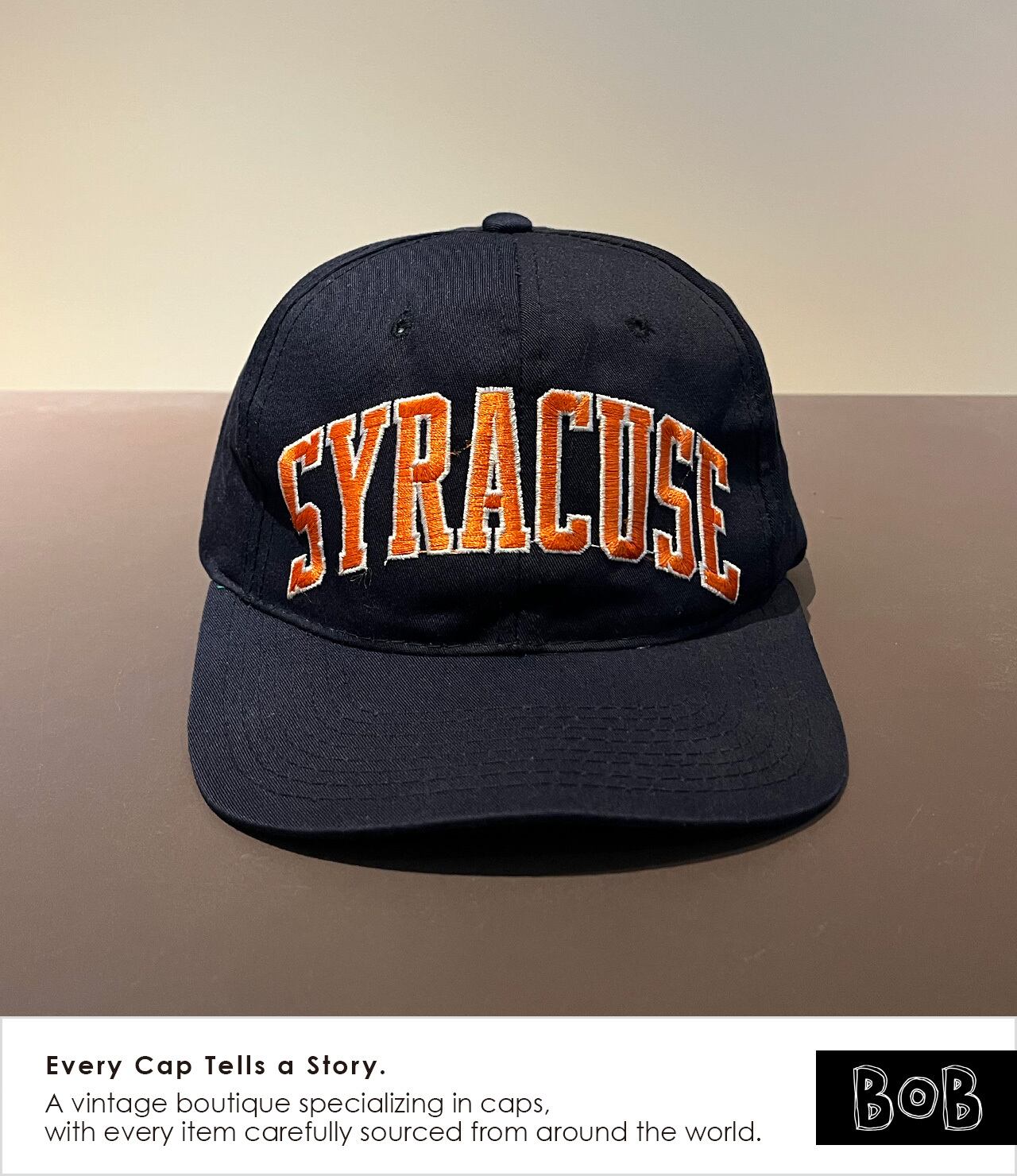 NCAAの名門「Syracuse University(シラキュース大学)」の90sカレッジキャップ。STARTER社製のネイビーボディにオレンジ×ホワイトのアーチロゴ刺繍。グリーンアンダーバイザー、スナップバック仕様など90sならではのディテール。