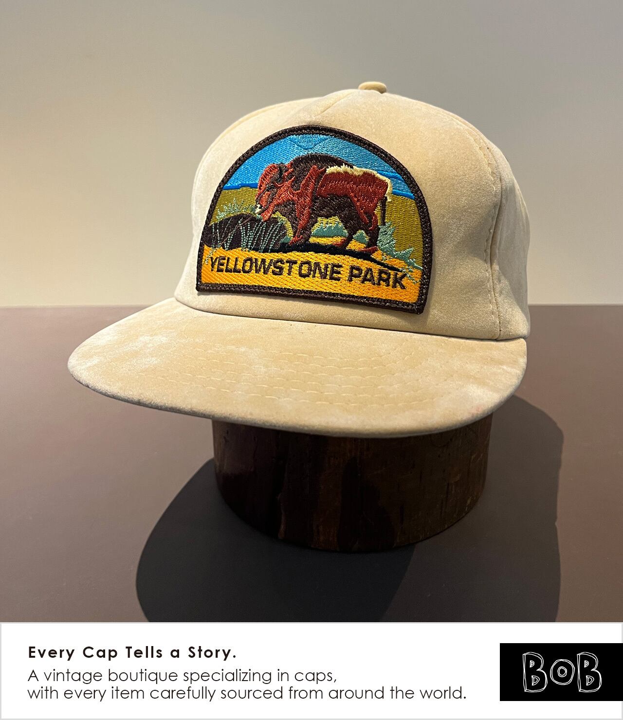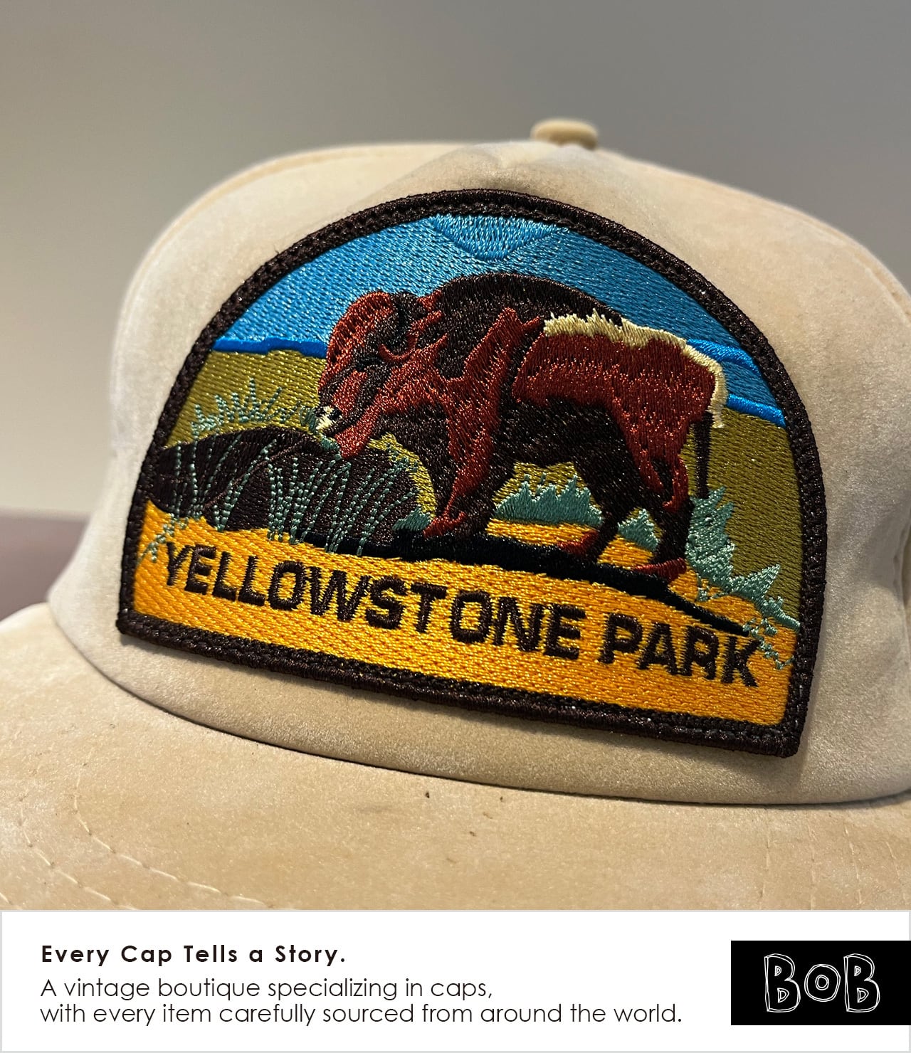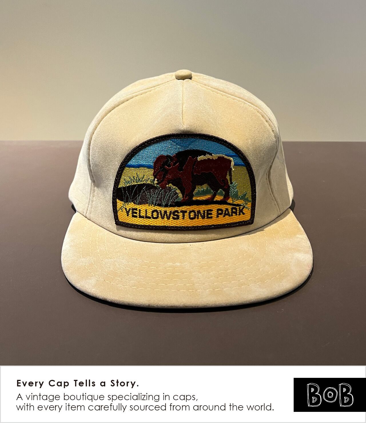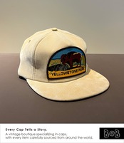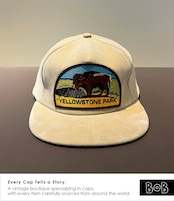 アメリカ最古の国立公園「Yellowstone Park」の1980s〜90s前半ころの5パネル・スーベニアキャップ。フロントには自然保護の象徴として語られてきたYellowstoneの象徴"バイソン"の刺繍ワッペン。クラウン深め。