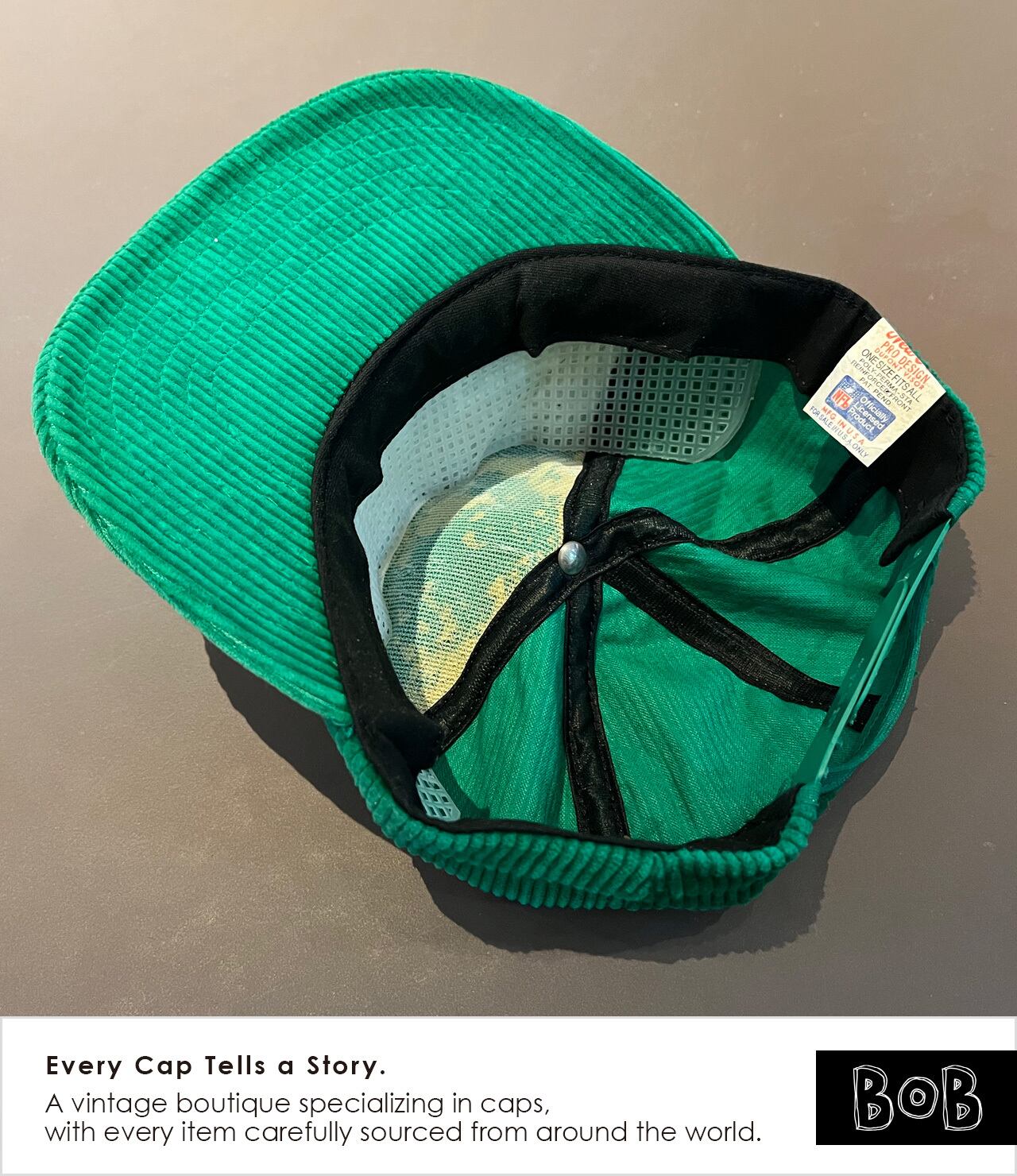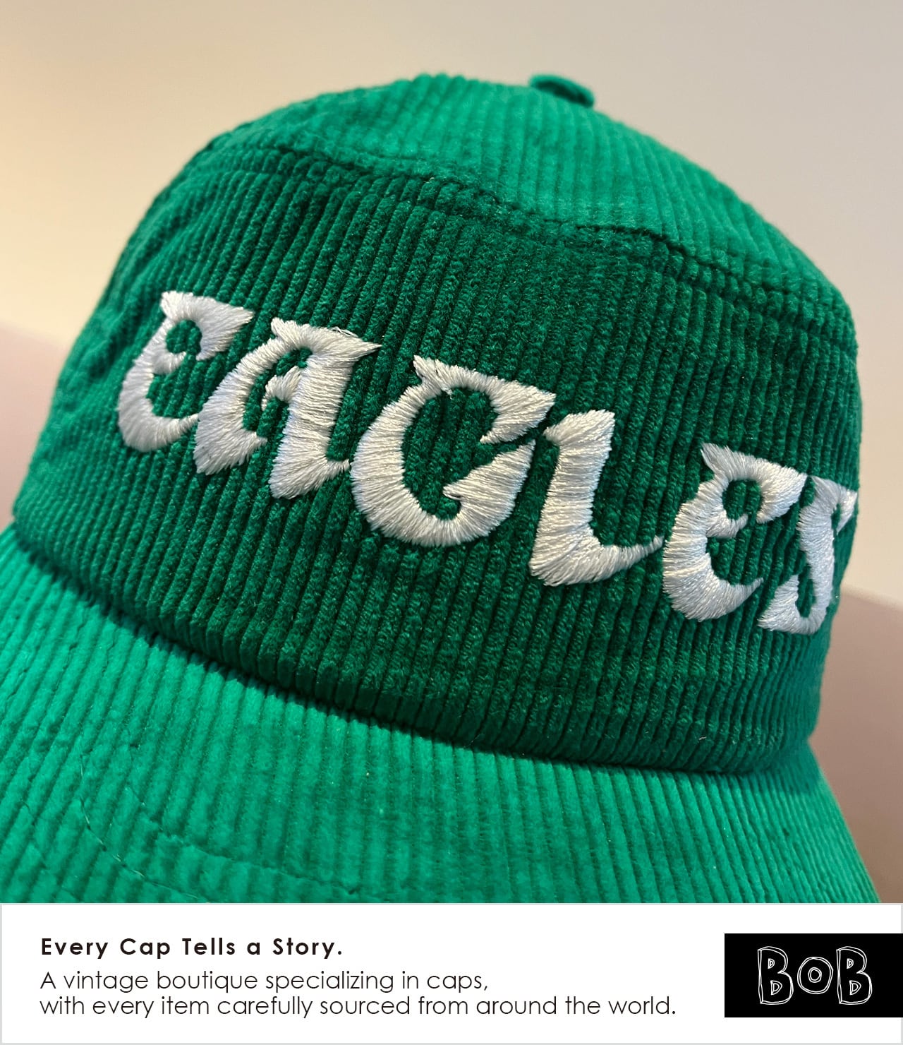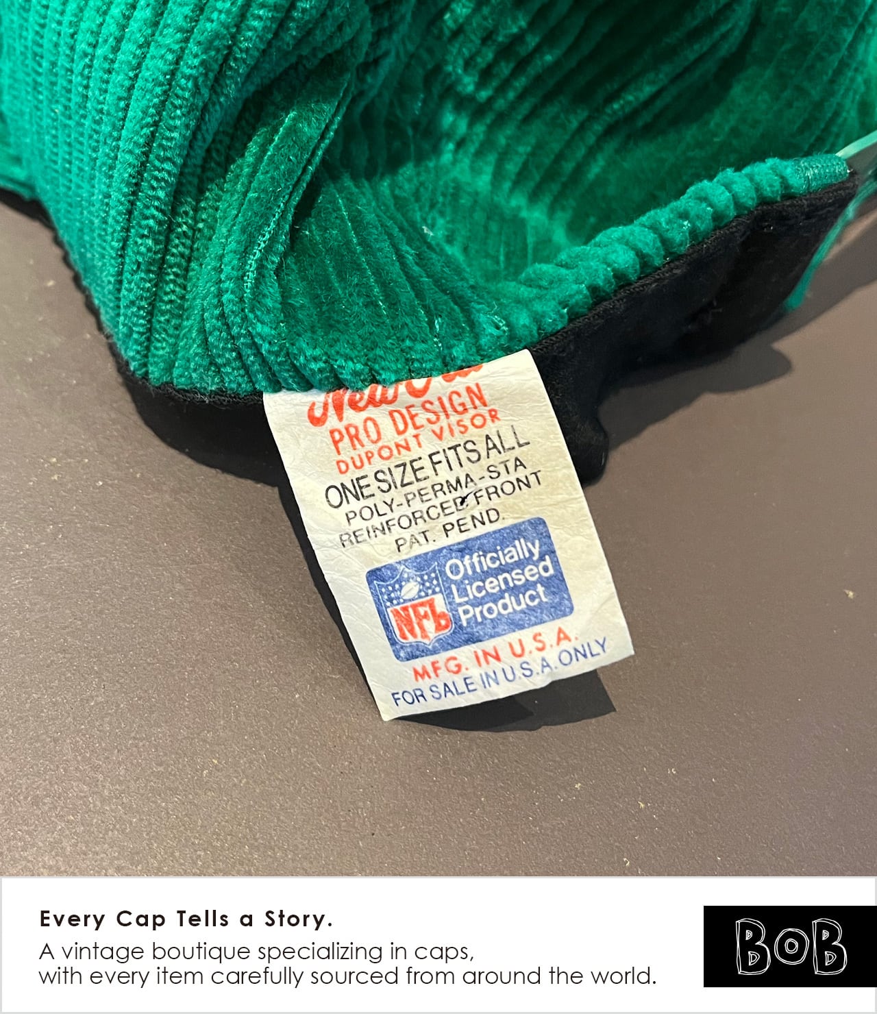 NFL Philadelphia Eagles(フィラデルフィア・イーグルス)の80sヴィンテージ・ニューエラ・コーデュロイキャップ。グリーンのUSA製コーデュロイボディに“EAGLES”のスクリプト刺繍のみで構成されたミニマルなデザイン。本品のNew Era「PRO DESIGN」タグは、DUPONT VISOR や PAT. PEND. 表記を含む1980年代の旧仕様。90年代以降には使われなくなる希少なタグです。