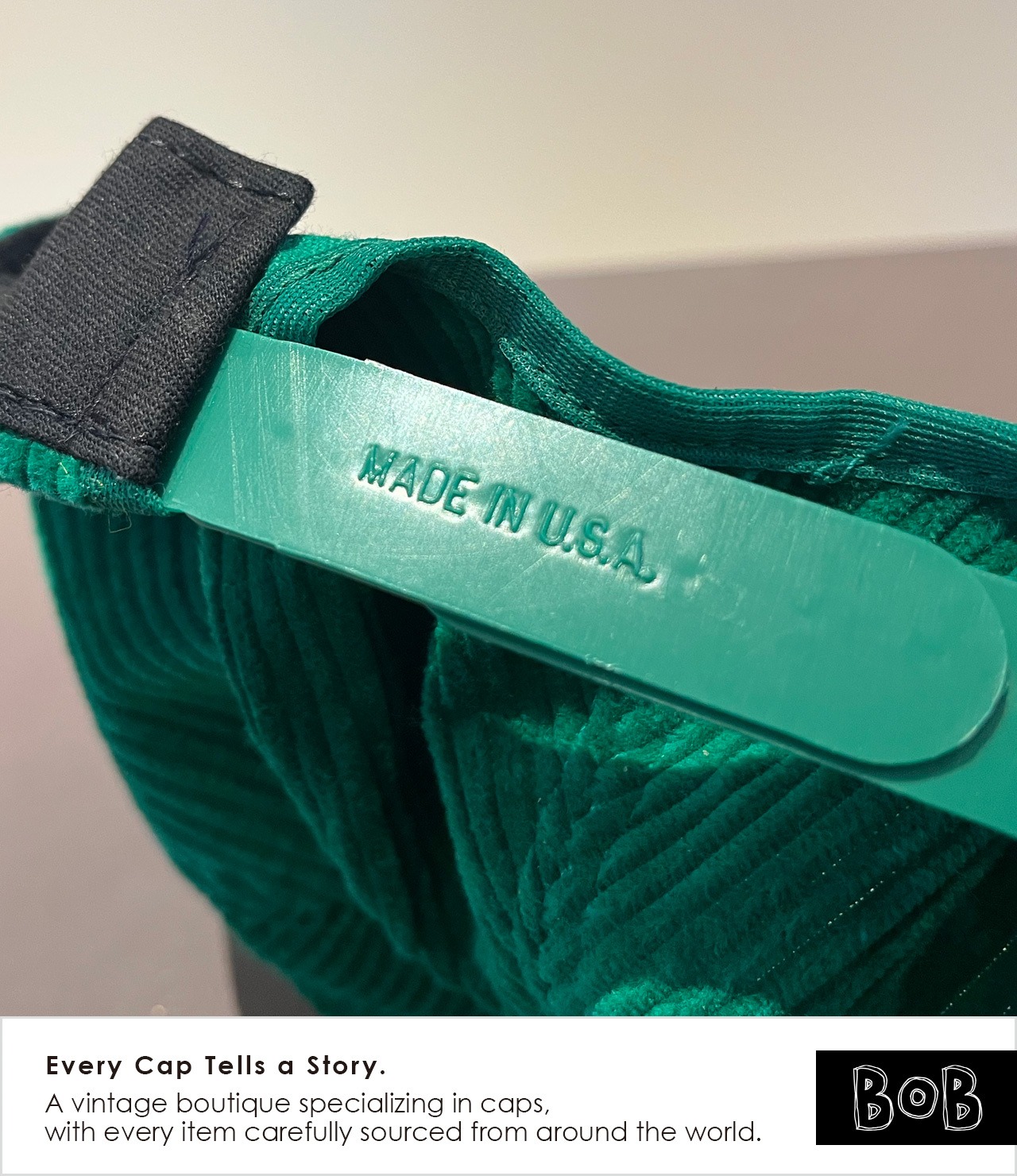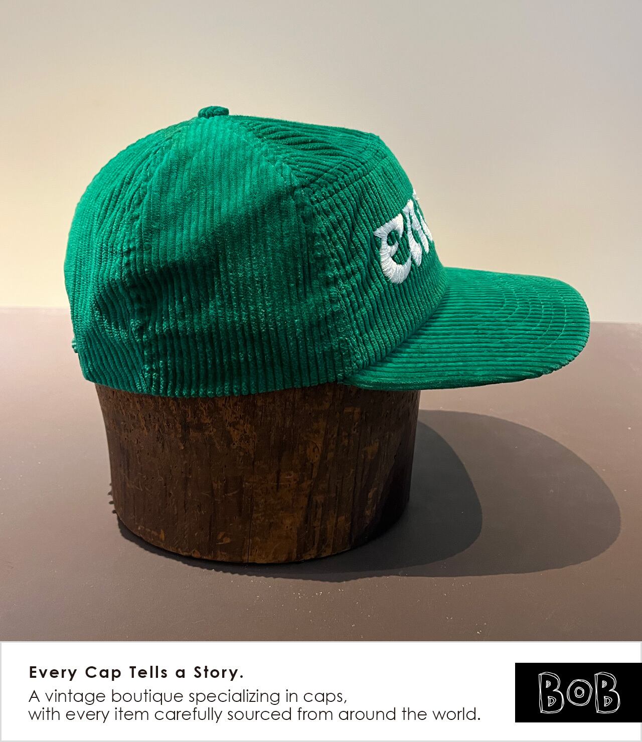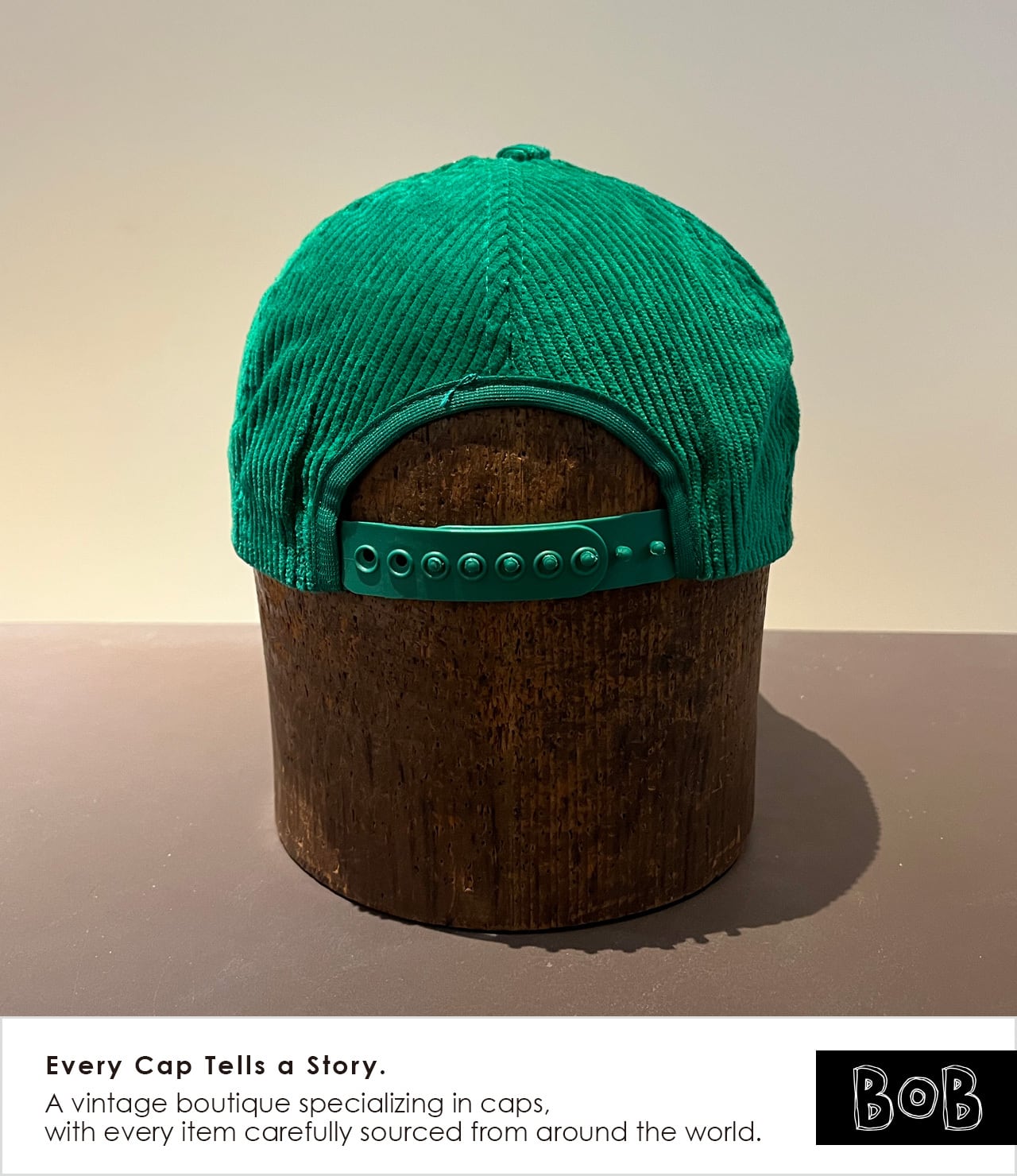 NFL Philadelphia Eagles(フィラデルフィア・イーグルス)の80sヴィンテージ・ニューエラ・コーデュロイキャップ。グリーンのUSA製コーデュロイボディに“EAGLES”のスクリプト刺繍のみで構成されたミニマルなデザイン。本品のNew Era「PRO DESIGN」タグは、DUPONT VISOR や PAT. PEND. 表記を含む1980年代の旧仕様。90年代以降には使われなくなる希少なタグです。