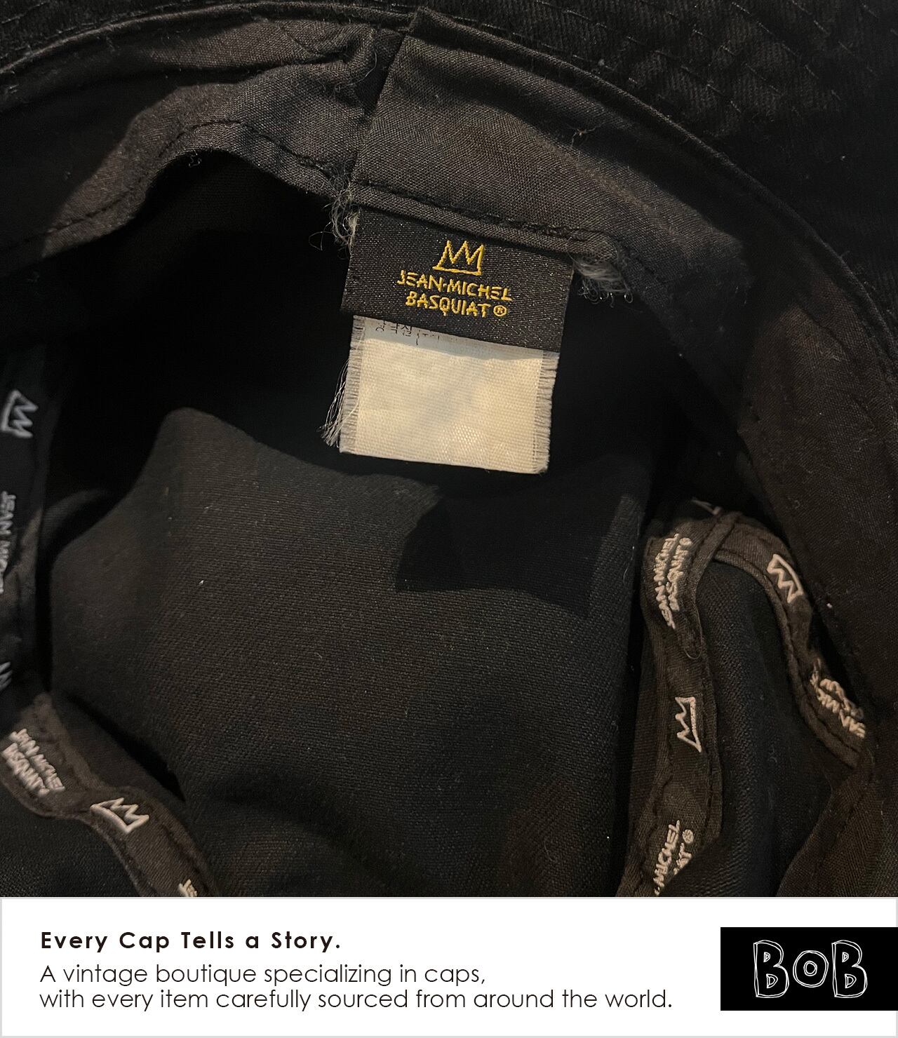 20世紀で最も影響力のあるアーティストの一人、Jean-Michel Basquiat(ジャン=ミシェル・バスキア)が、黒人初のヘビー級世界王者「Jack Johnson(ジャック・ジョンソン)」をモチーフに落とし込んだバケットハット。サイドには王冠ピスネーム。内側の汗止めテープ(ビン革)にも「JEAN-MICHEL BASQUIAT」のロゴと王冠がリピートプリントされてます。© Estate of Jean-Michel Basquiat / Licensed by Artestar, New York