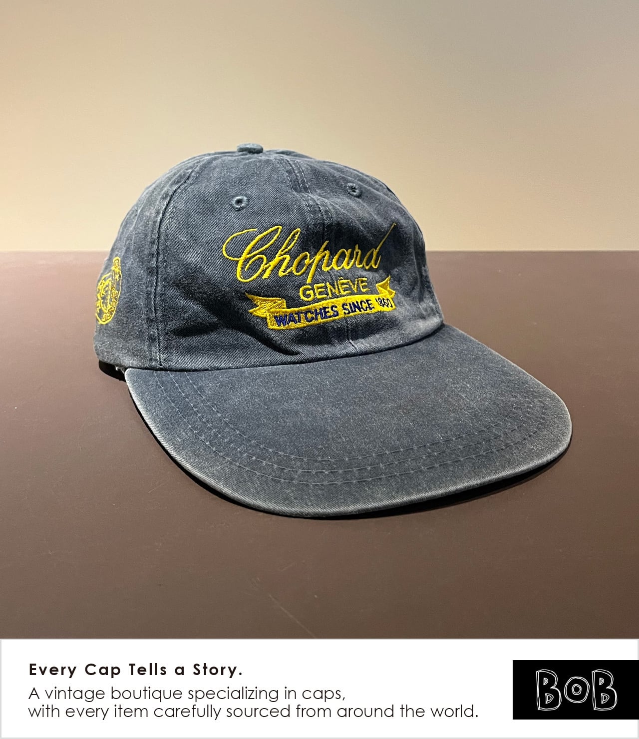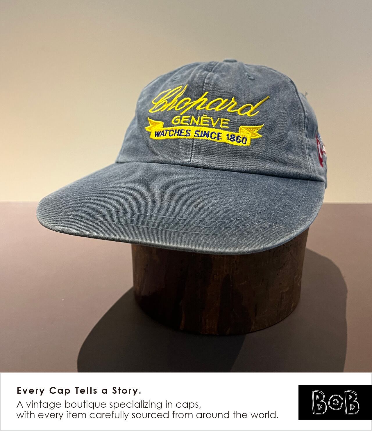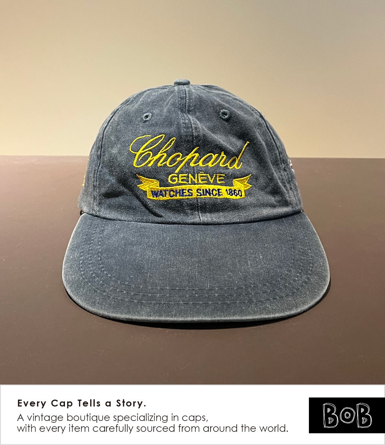 夏のアメリカ・モントレーで開催されるクラシックカーイベント「MONTEREY HISTORIC」において、1998年にスイスの老舗時計ブランドChopardがパートナーを務めた際のプロモキャップです。Chopardの現会長カール=フリードリッヒ・ショイフレ氏は、大のクラシックカーコレクターとして知られています。時計製造における「精密さ」と、ヴィンテージマシンの「美学」。その2つが共鳴する場所で、限られた関係者やエントラントのみが手にすることができたアイテム。バイザー長め。フェードもいい感じです。