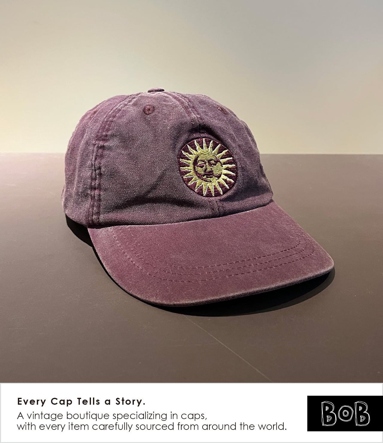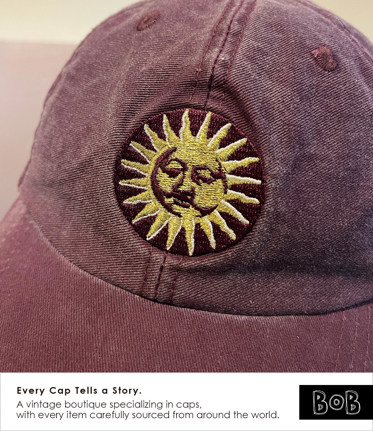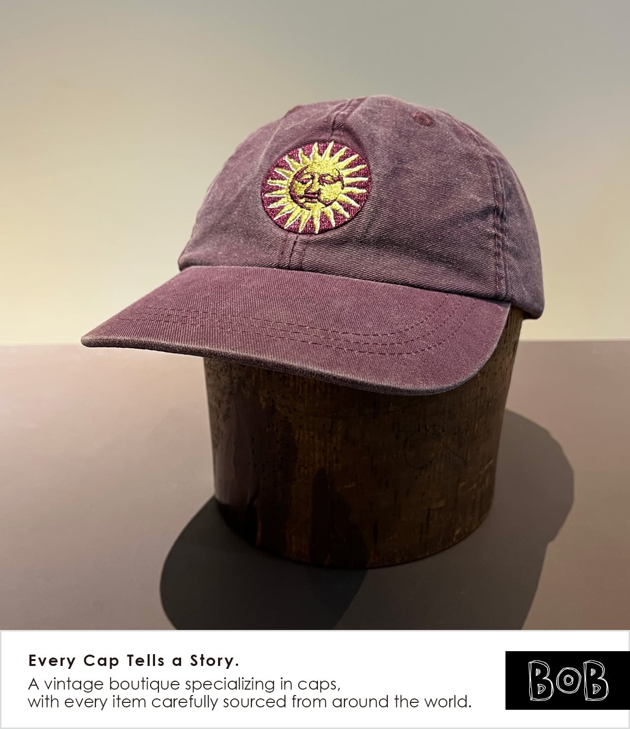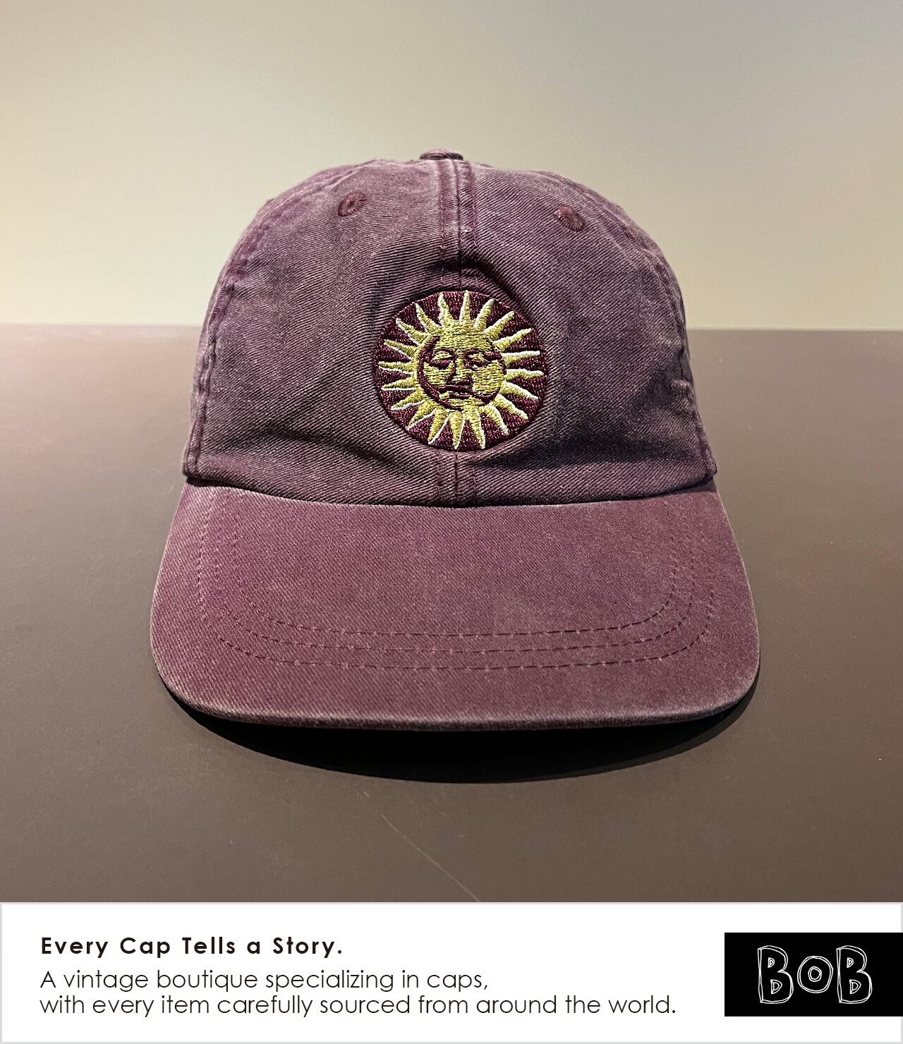 正体不明のお店「Baja Luna」の90sプロモキャップ。メキシコ〜アメリカ南西部の民芸を思わせる太陽モチーフのデザイン。フェードしたボルドーパープルにゴールドの刺繍がいいムード。