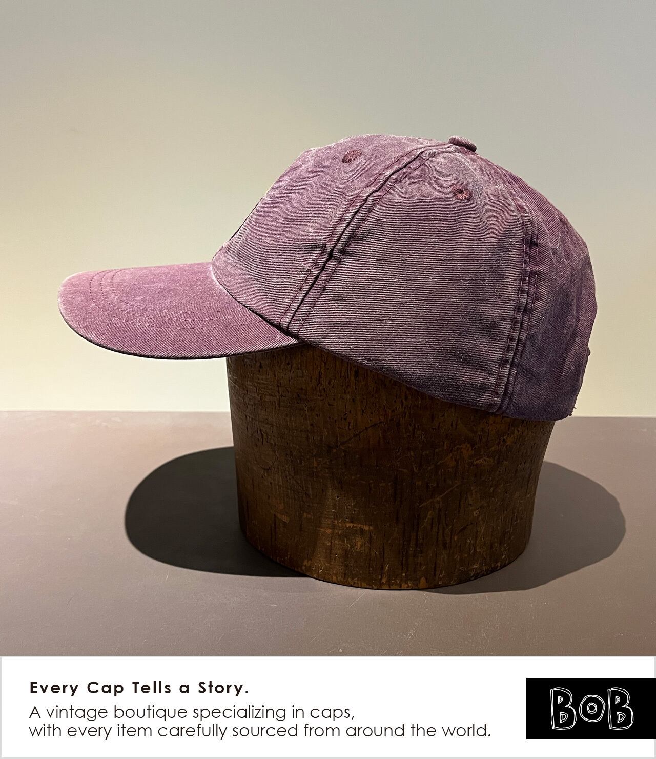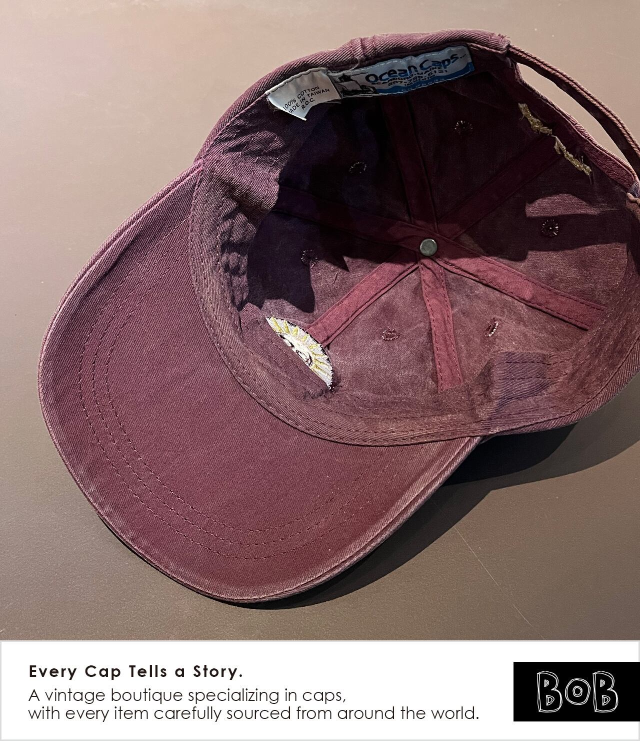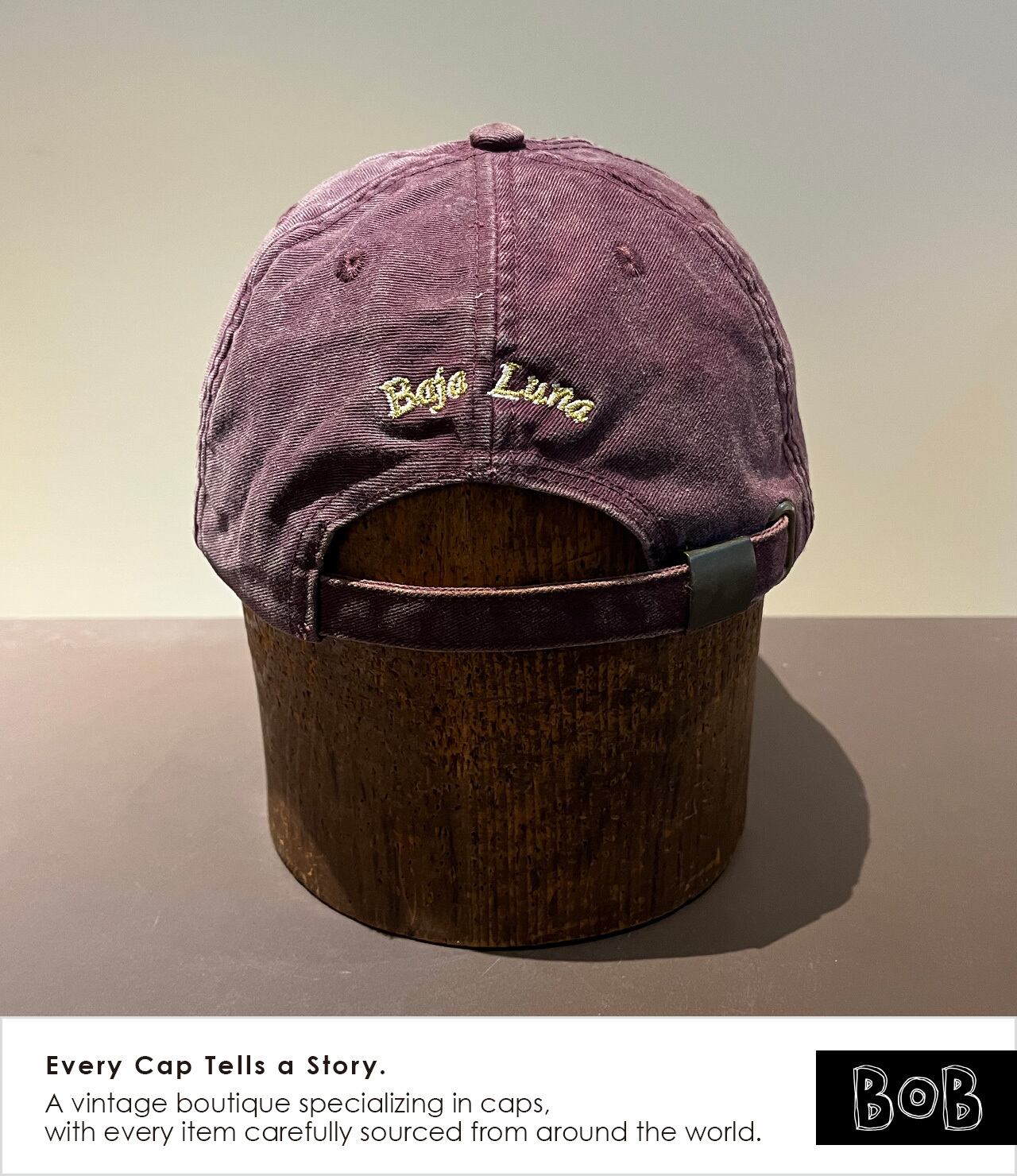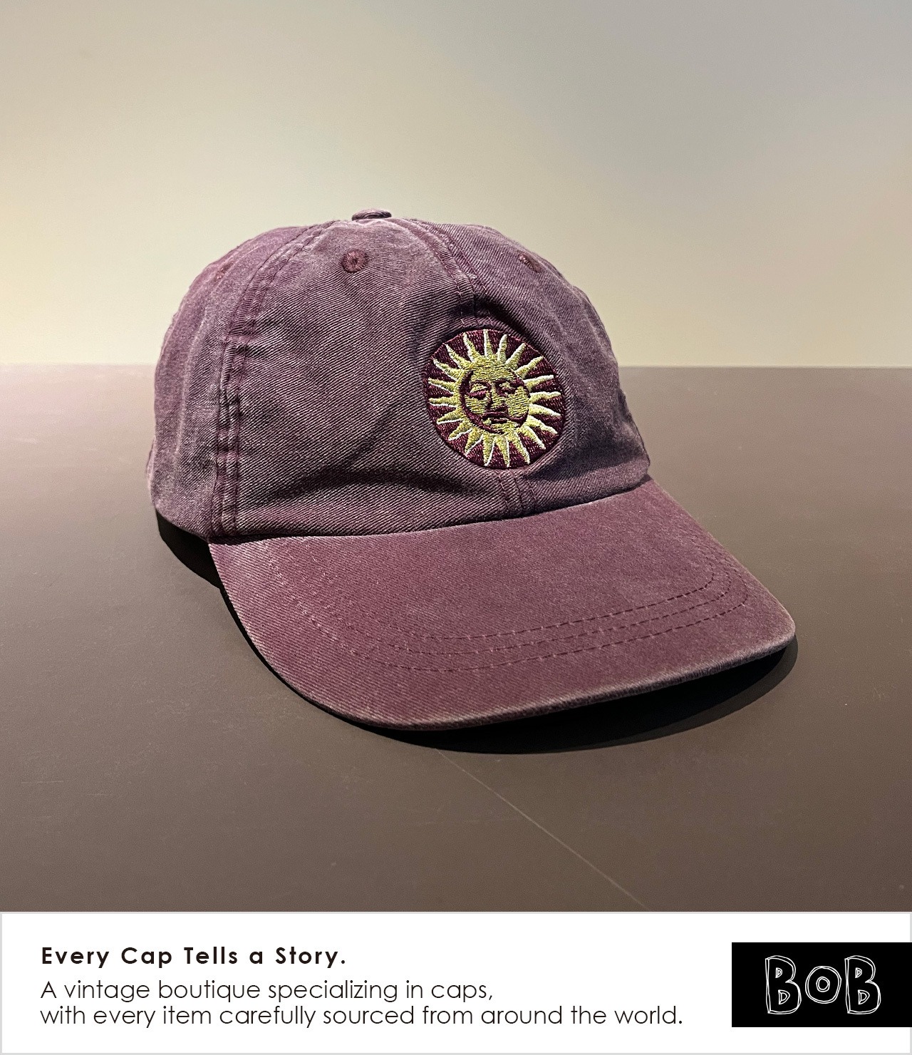 正体不明のお店「Baja Luna」の90sプロモキャップ。メキシコ〜アメリカ南西部の民芸を思わせる太陽モチーフのデザイン。フェードしたボルドーパープルにゴールドの刺繍がいいムード。