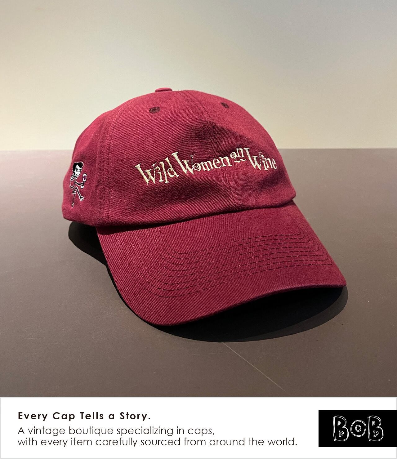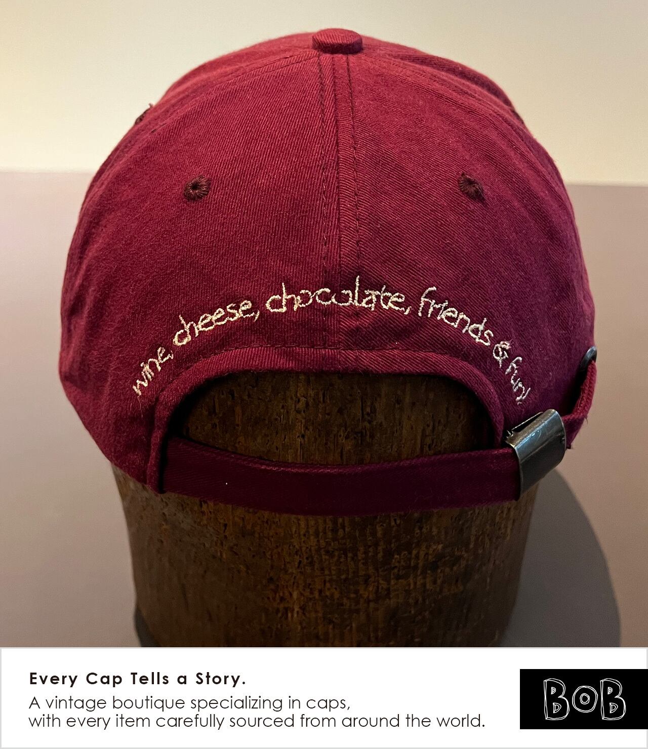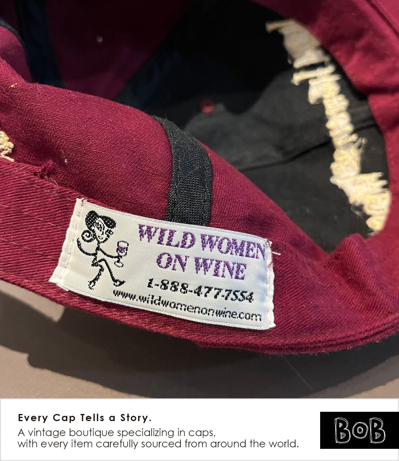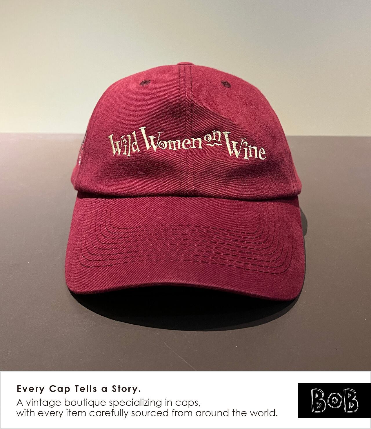 2000年代初頭のムーブメントであり、ワイン好き女性たちのコミュニティ「Wild Women on Wine」のキャップです。ボディカラーはもちろんワインレッド。バックには「wine, cheese, chocolate, friends & fun!」のメッセージ。ワイン好きのあの娘に!