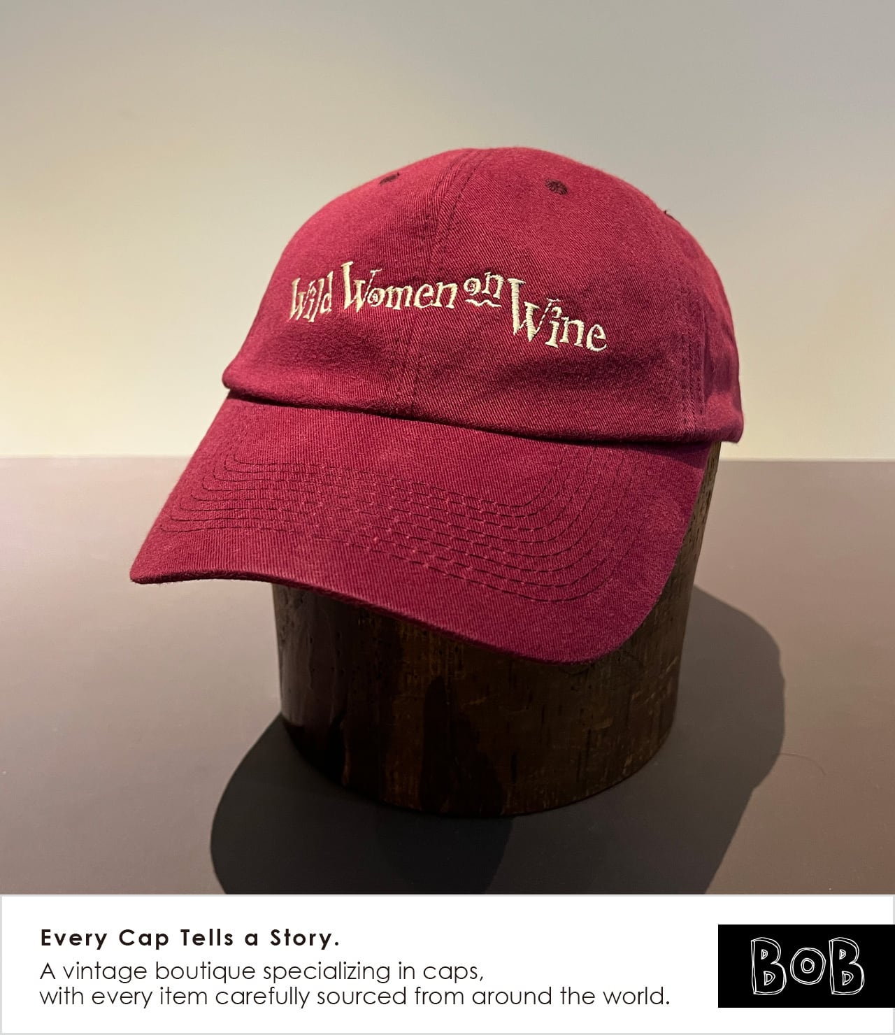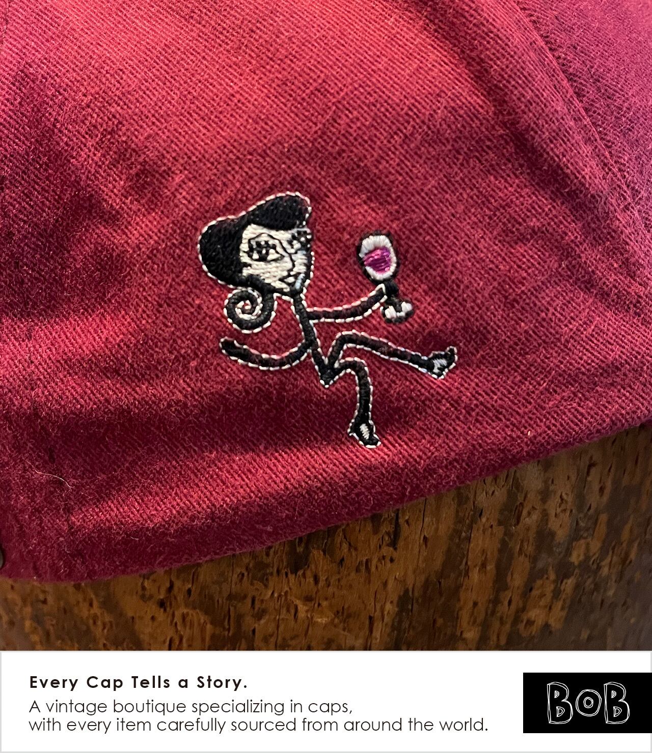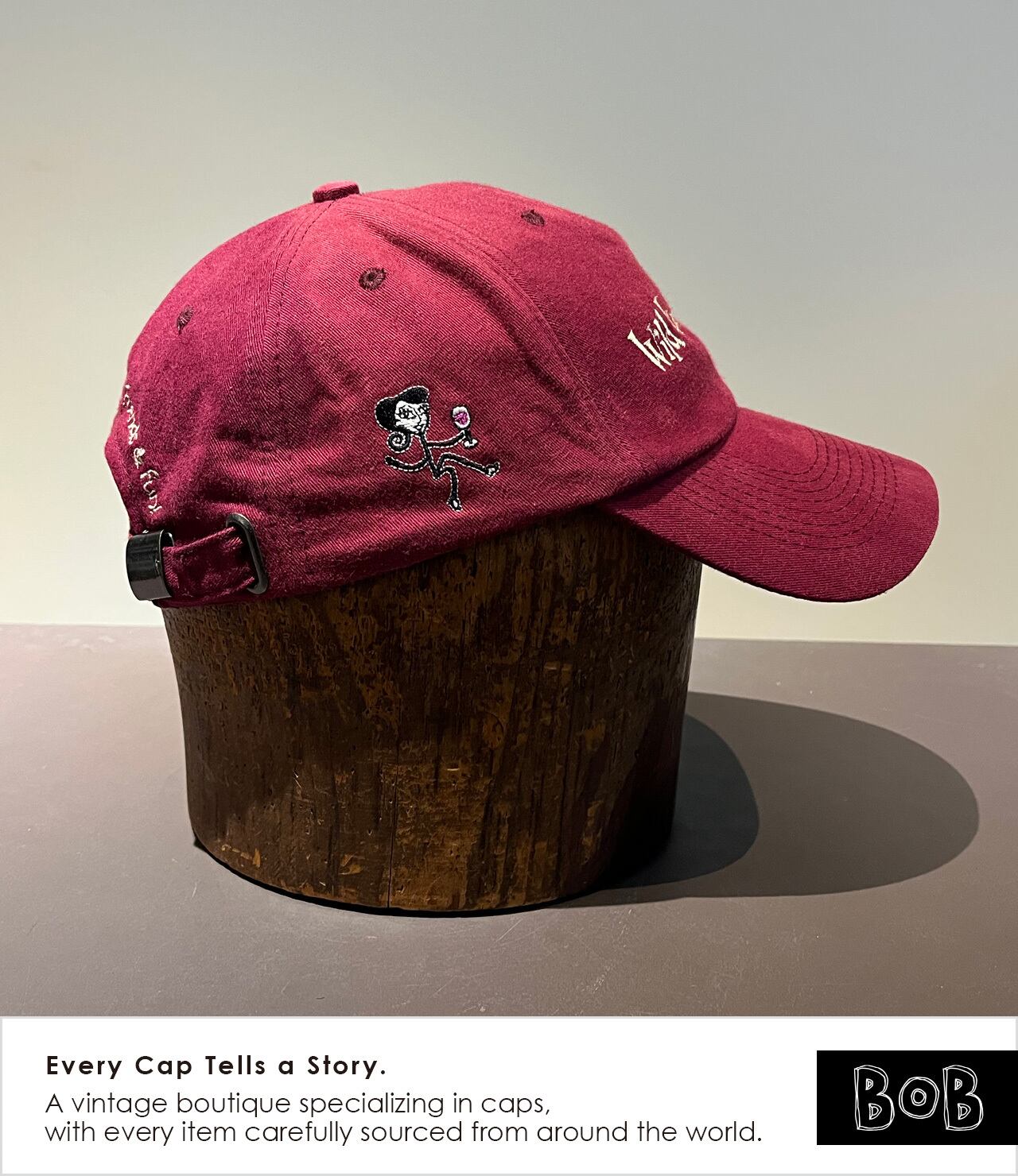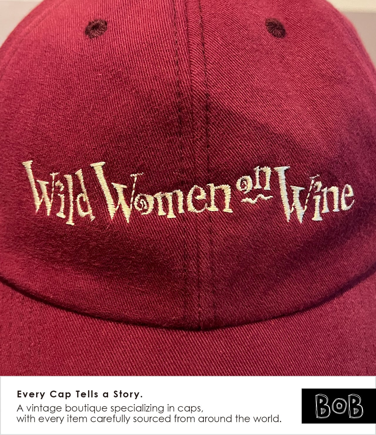 2000年代初頭のムーブメントであり、ワイン好き女性たちのコミュニティ「Wild Women on Wine」のキャップです。ボディカラーはもちろんワインレッド。バックには「wine, cheese, chocolate, friends & fun!」のメッセージ。ワイン好きのあの娘に!