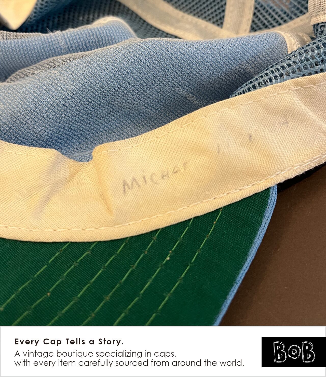 USA製New Eraの旧タグ(ヴィンテージ・ニューエラ)80sメッシュキャップ。どこかの誰かのために作られた当時のニュージャージー州ローカルオーダー品でフロントには筆記体で “E” ロゴ刺繍。
