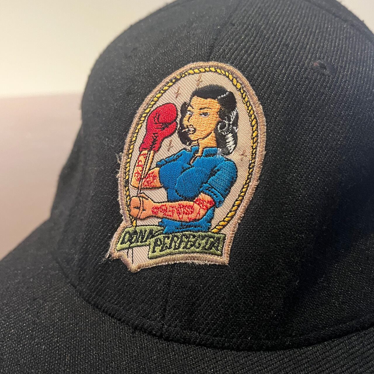 フロントには、ボクシンググローブを構えた女性と「DONA PERFECTA(完璧な女性)」と書かれたクラシカルな刺繍ワッペン。